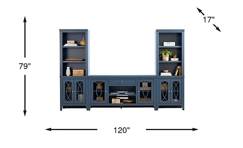 Bring sleek style and smart storage to your living room with the Abbie II wall unit. The center console features a wide center drawer above open shelving, complete with discreet cutouts for cord management to keep electronics organized and out of sight. Glass-front cabinet doors with geometric overlay detailing conceal essentials with ease while still offering a touch of contemporary polish. Flanking piers echo the design of the console, each offering three open shelves above a closed cabinet base, creating space for both display and storage. A gorgeous blue finish brightens the entire set, while brushed silver hardware adds a refined final touch.
