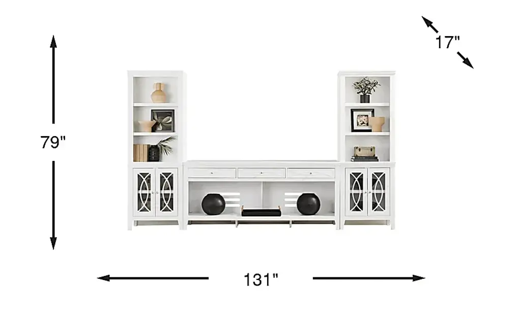 Bring sleek style and smart storage to your living room with the Abbie II wall unit. The center console includes three spacious drawers along the top for essentials and two wide open shelves with cutouts in the back for easy cord management. Flanking piers echo the design of the console, each with three open shelves above a closed cabinet base that has glass-front doors featuring geometric overlay detailing that helps conceal essentials with ease. A gorgeous white finish brightens the entire set, while brushed silver hardware adds a refined final touch.