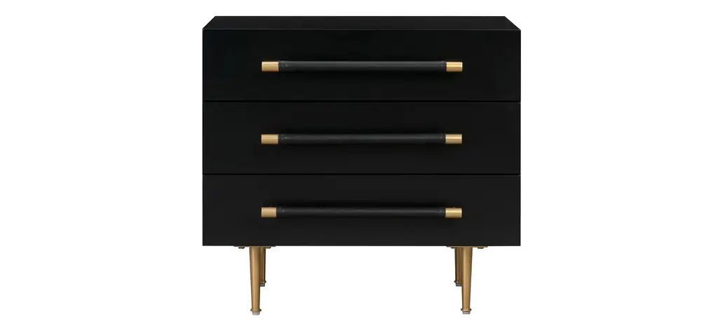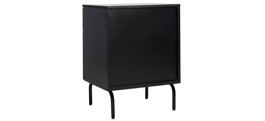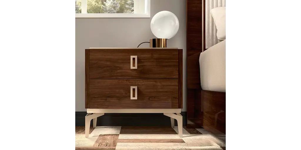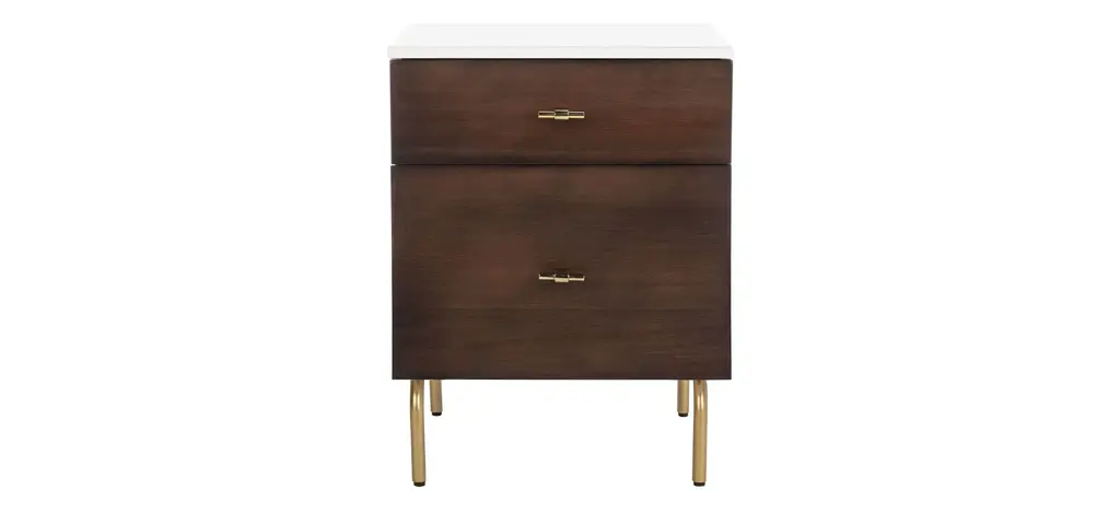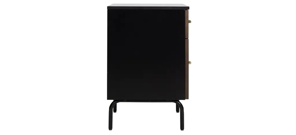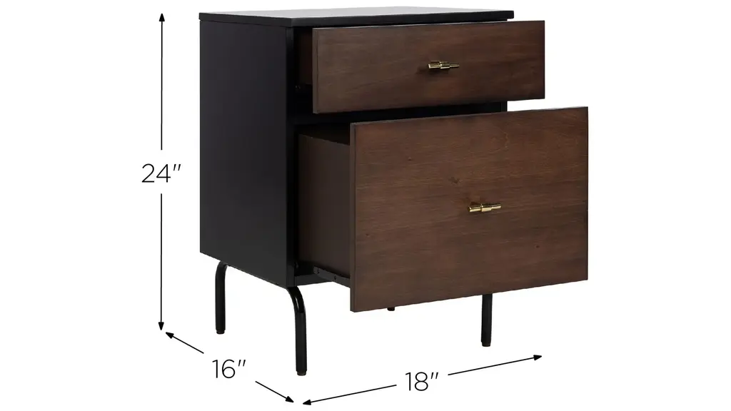 Elegant and modern, the natural beauty of the Abbie nightstand adds style and warmth to any bedroom. Finely crafted of mahogany wood, Abbie's rich walnut finish and black metal legs give it vintage style charm. Two spacious drawers make for easy storage.