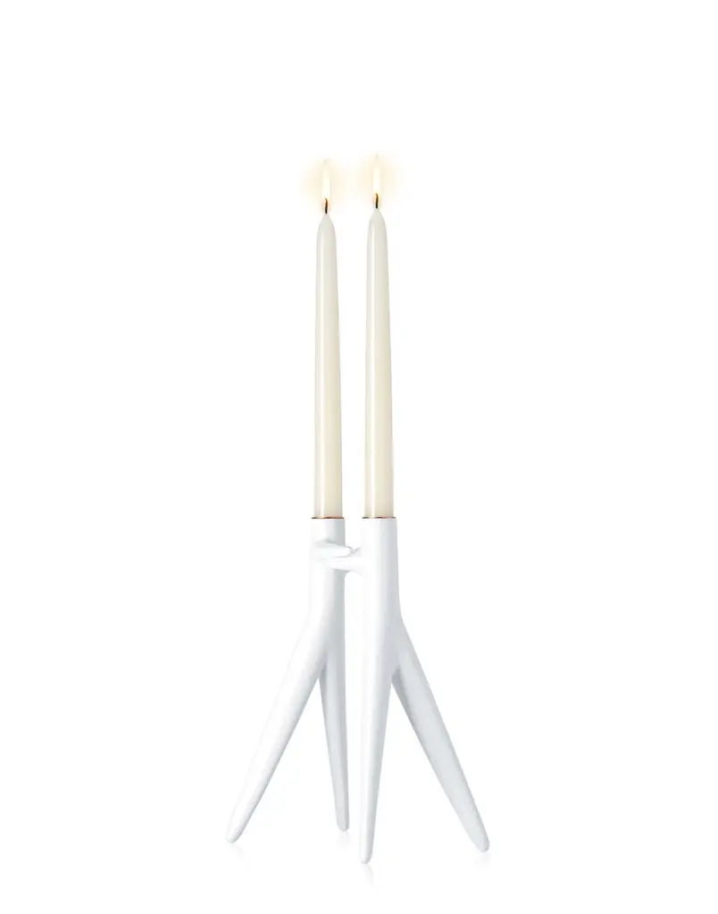 Abbracciaio is an aluminium casting of two shapes which, when placed one in front of the other, become a loving embrace. The two structures composing the candelabra link together giving the piece stability.