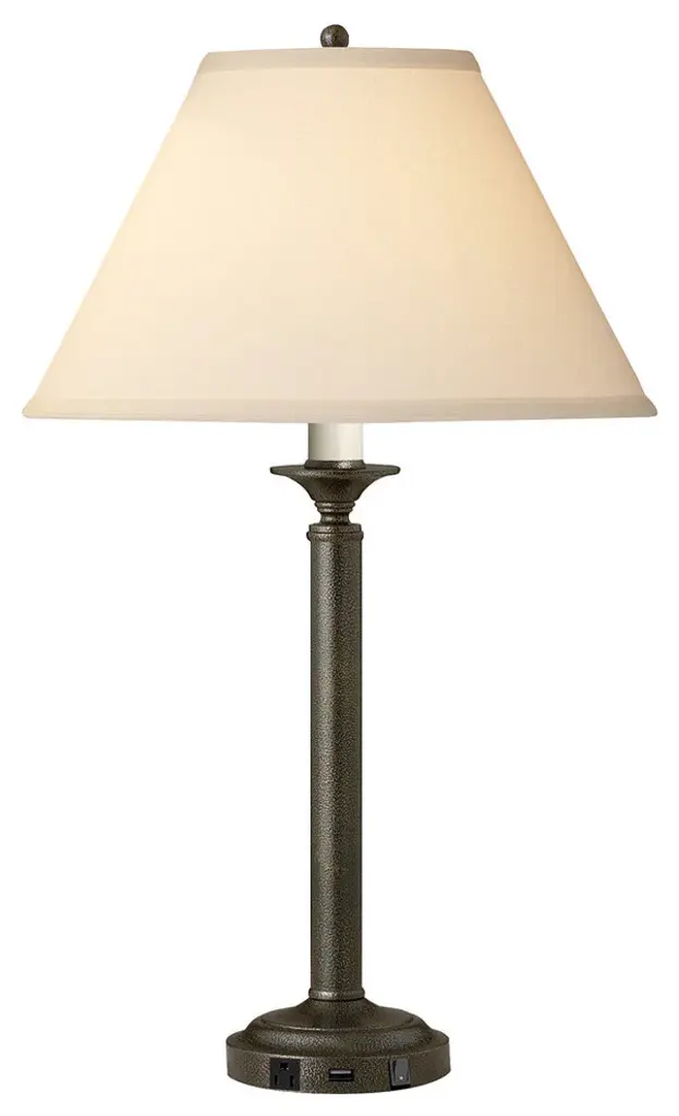Standard Lamp Specifications for #U2E452:Product Type: Desk LampHeight: 26"''Finish: Hammertone BronzeConstruction: SteelSocket: (2) Aluminum On/Off Med. Base Type A 60W Max socket(s). (Bulb not included)Switching: (2) On/Off Rocker switch(es) located on the base.Cord: 7.5'' (from base) long black 16 gauge cord set with a 3 prong grounded plug.Electrical Outlet: (2) 3 prong grounded outlet(s).Data Port: None.USB Port: (1) 10W/2A USB port(s).UL/CUL and/or ETL listed: YesHarp Pipe Size: 7.25 inches (bead-to-bead)Standard Packing: 2 per carton (shade packed separately).Lamps & Shades per SKU: 1Lamping: (2) Aluminum On/Off Med. Base Type A 60W Max socket(s).Shade Size and Description: Light beige lenore fabric laminated to rectangular styrene hardback with self fold trim. measuring 5"/7" x 9"/16" x 10" w/1" drop (Top x Bottom x Slant).Bulb Included: NoMaterial Description: constructed from polished, plated, and lacquered steel.