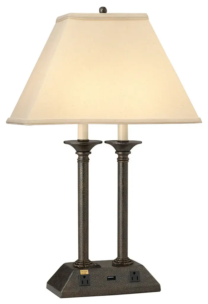 Standard Lamp Specifications for #U2E452:Product Type: Desk LampHeight: 26"''Finish: Hammertone BronzeConstruction: SteelSocket: (2) Aluminum On/Off Med. Base Type A 60W Max socket(s). (Bulb not included)Switching: (2) On/Off Rocker switch(es) located on the base.Cord: 7.5'' (from base) long black 16 gauge cord set with a 3 prong grounded plug.Electrical Outlet: (2) 3 prong grounded outlet(s).Data Port: None.USB Port: (1) 10W/2A USB port(s).UL/CUL and/or ETL listed: YesHarp Pipe Size: 7.25 inches (bead-to-bead)Standard Packing: 2 per carton (shade packed separately).Lamps & Shades per SKU: 1Lamping: (2) Aluminum On/Off Med. Base Type A 60W Max socket(s).Shade Size and Description: Light beige lenore fabric laminated to rectangular styrene hardback with self fold trim. measuring 5"/7" x 9"/16" x 10" w/1" drop (Top x Bottom x Slant).Bulb Included: NoMaterial Description: constructed from polished, plated, and lacquered steel.