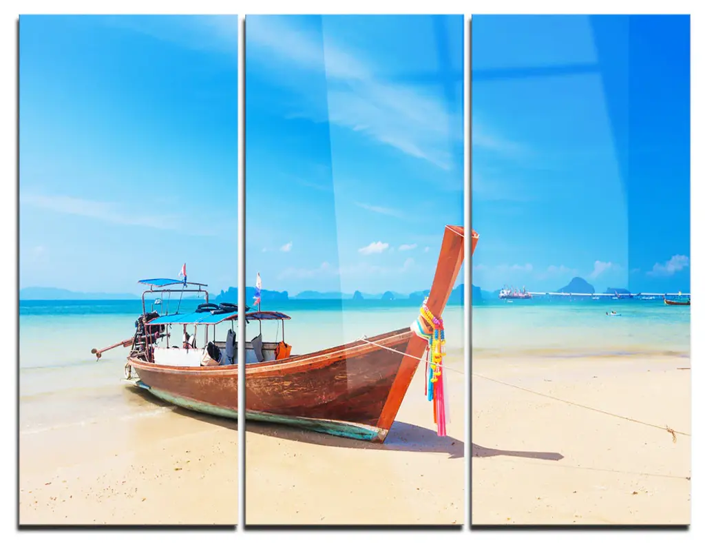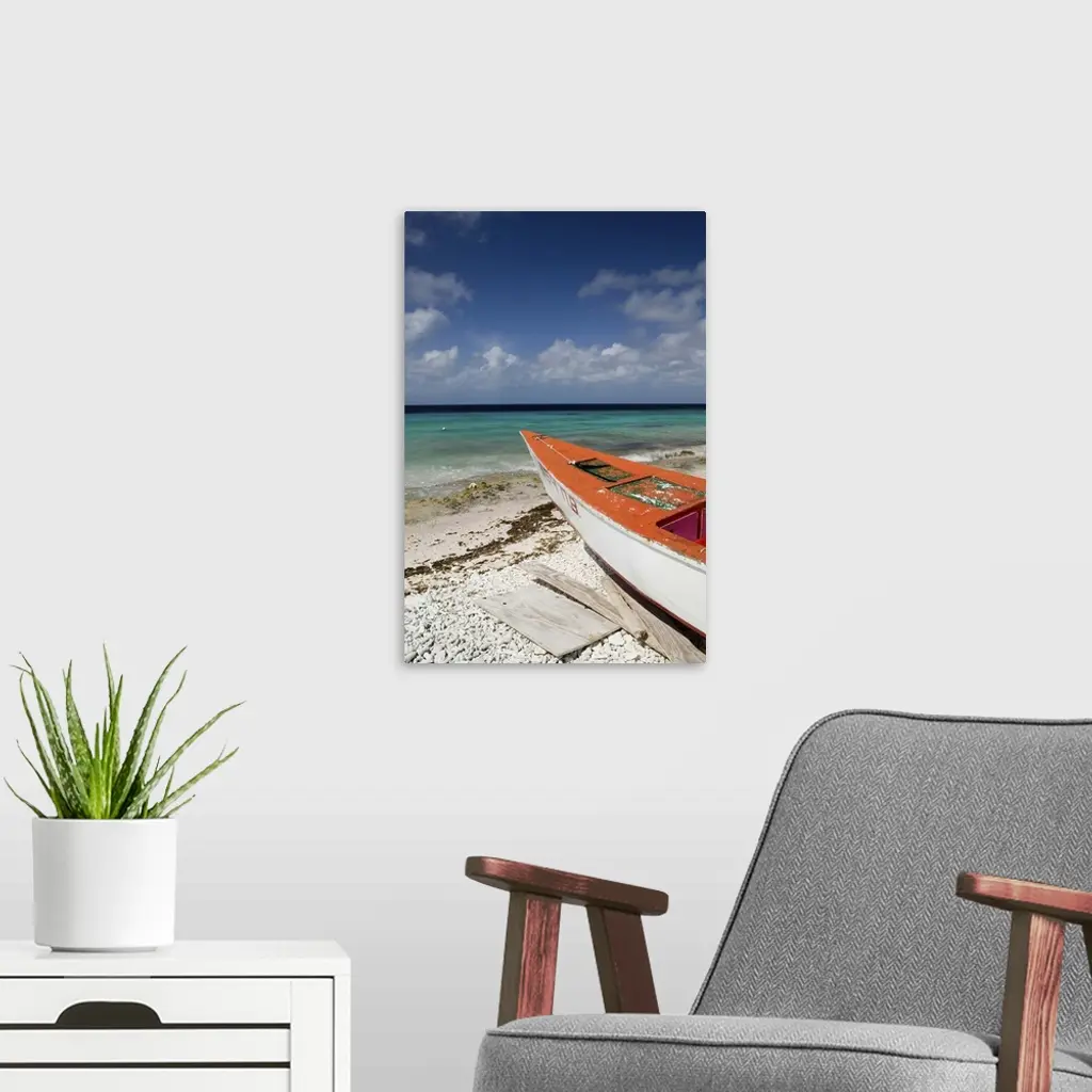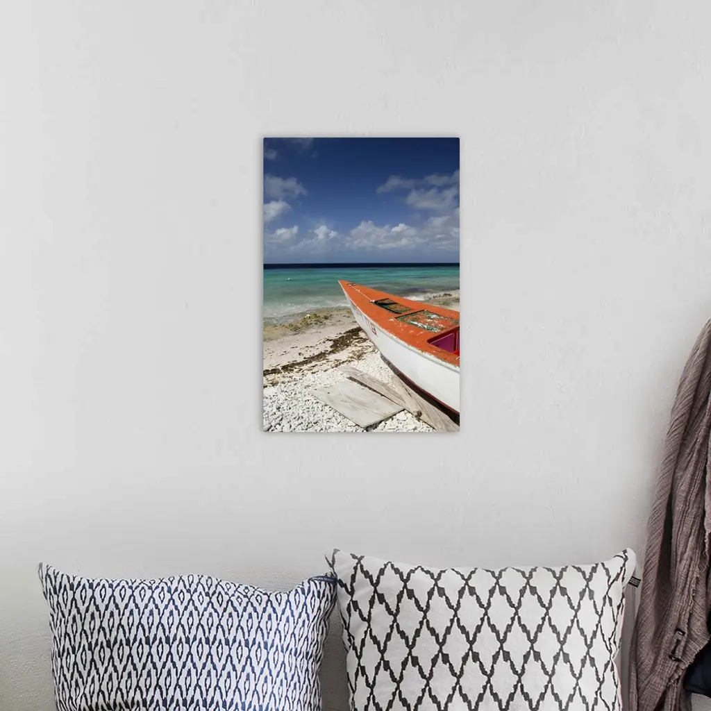 ABC Islands-BONAIRE-Pink Beach:.Beach View with Fishing Boat