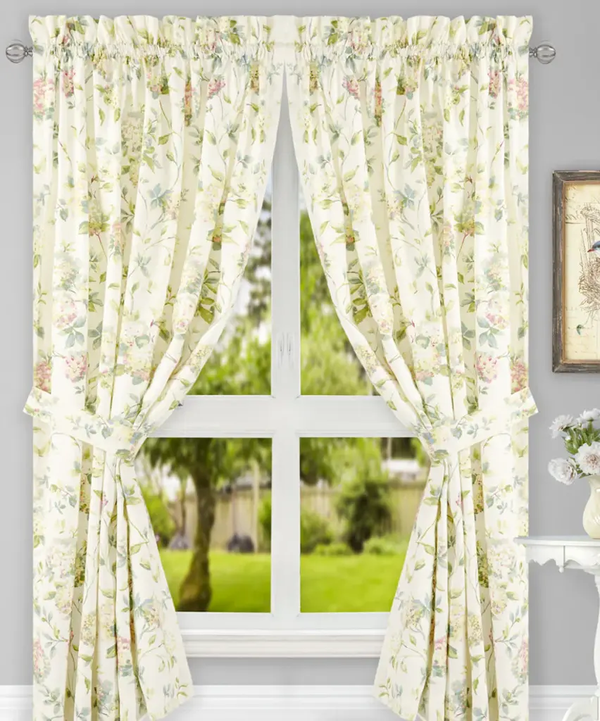 Bring the gorgeous sights of Spring indoors. Our traditional hydrangea pattern on high quality fabric will drape beautifully and bring a breath of fresh air into the entire room. Abigail is a multi colored traditional Hydrangea floral print pattern on solid natural colored ground that features a range of shades and colors that coordinate easily with a variety of solids and patterns within your home. Made with 52-percent polyester/48-percent 5-ounce cotton fabric creates a smooth draping effect, soft texture and easy maintenance. Each curtain panel is constructed with a 1.5-inch rod pocket, decorative 2.5-inch header, and 3-inch bottom hem. Width is measured overall 82-inches (both 41-inch panels together) making them perfect for both wide and narrow windows. Length is measured overall 84-inches from top stitch (ruffle stitch above the rod pocket) to bottom of panel and includes two standard tiebacks. For wider windows simply add multiple panels together. Abigail Tailored Panel Pair Curtains can be combined with a choice of 3 coordinating Valance Top Treatments, Tiers and Shower curtains. Machine washable.