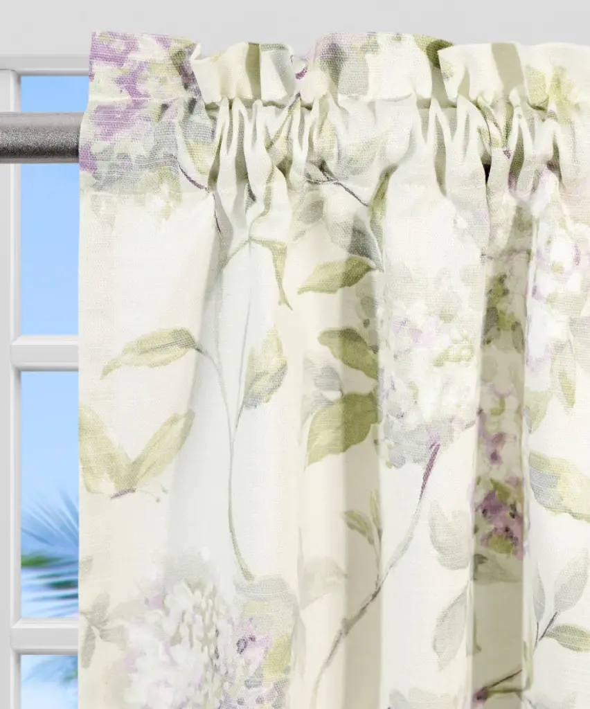 Bring the gorgeous sights of Spring indoors. Our traditional hydrangea pattern on high quality fabric will drape beautifully and bring a breath of fresh air into the entire room. Abigail is a multi colored traditional Hydrangea floral print pattern on solid natural colored ground that features a range of shades and colors that coordinate easily with a variety of solids and patterns within your home. Made with 52-percent polyester/48-percent 5-ounce cotton fabric creates a smooth draping effect, soft texture and easy maintenance.Tailored Tier curtains are used to cover the lower portion of your windows or used alone on shorter length windows. Each curtain panel is constructed with a 1.5-inch rod pocket, 1-inch header, and 3-inch bottom hem. Sold in pairs (2 Panels) Width is measured overall 56-inches per pair of panels (both 28-inch panels together) Length is measured overall 24-inches from header top (ruffle above the rod pocket) to bottom of panel. For wider windows simply add multiple panels together. Abigail Tailored Tier Curtains can be combined with a choice of 3 matching Abigail Valances, Panels with Tiebacks and Shower Curtain. Machine washable.