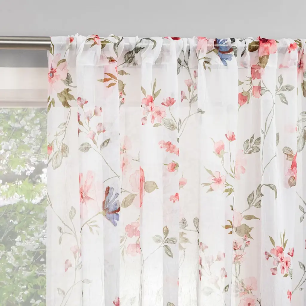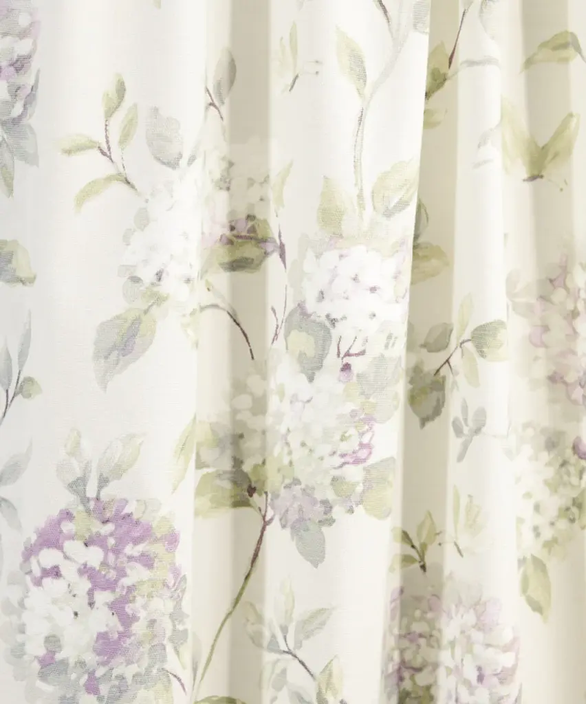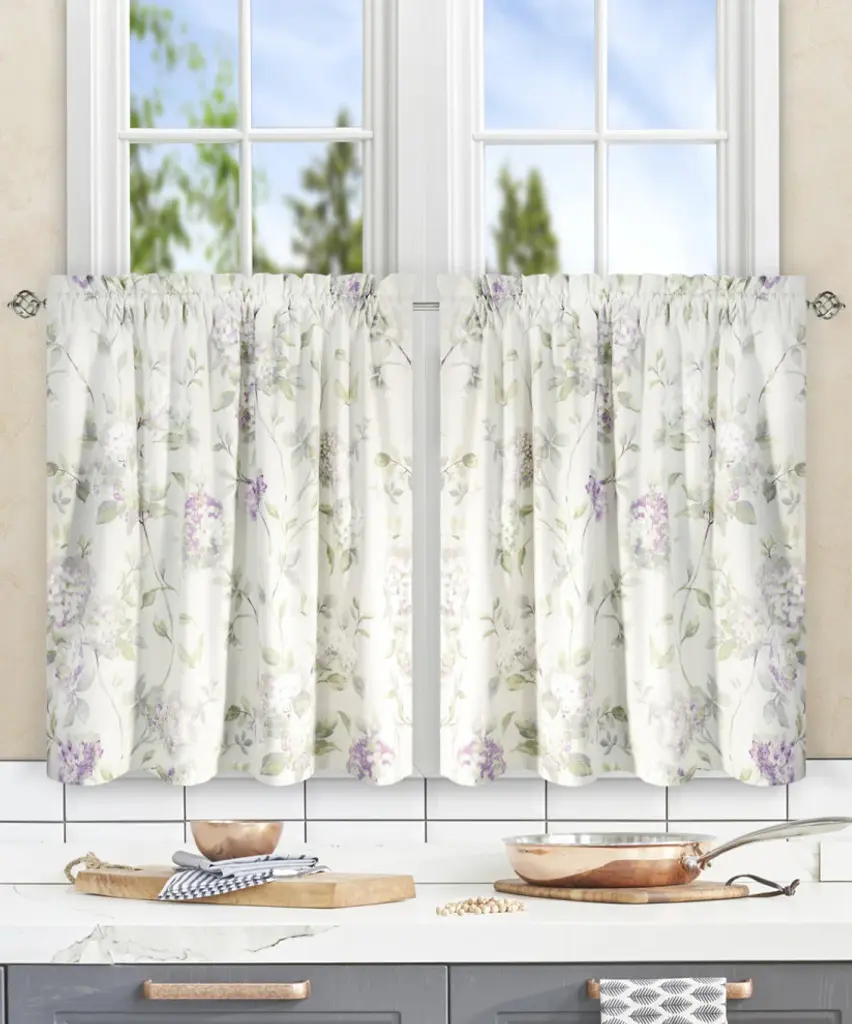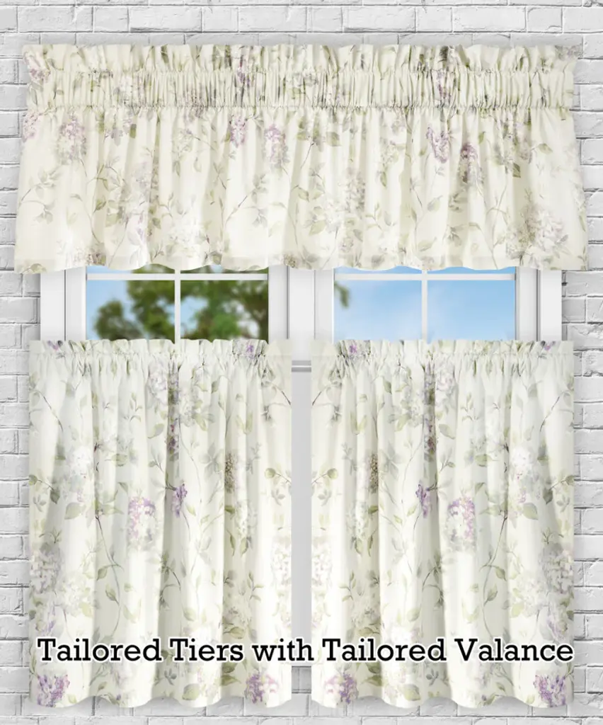 Bring the gorgeous sights of Spring indoors. Our traditional hydrangea pattern on high quality fabric will drape beautifully and bring a breath of fresh air into the entire room. Abigail is a multi colored traditional Hydrangea floral print pattern on solid natural colored ground that features a range of shades and colors that coordinate easily with a variety of solids and patterns within your home. Made with 52-percent polyester/48-percent 5-ounce cotton fabric creates a smooth draping effect, soft texture and easy maintenance.Tailored Tier curtains are used to cover the lower portion of your windows or used alone on shorter length windows. Each curtain panel is constructed with a 1.5-inch rod pocket, 1-inch header, and 3-inch bottom hem. Sold in pairs (2 Panels) Width is measured overall 56-inches per pair of panels (both 28-inch panels together) Length is measured overall 36-inches from header top (ruffle above the rod pocket) to bottom of panel. For wider windows simply add multiple panels together. Abigail Tailored Tier Curtains can be combined with a choice of 3 matching Abigail Valances, Panels with Tiebacks and Shower Curtain. Machine washable.