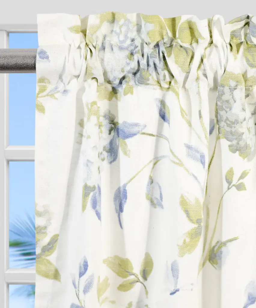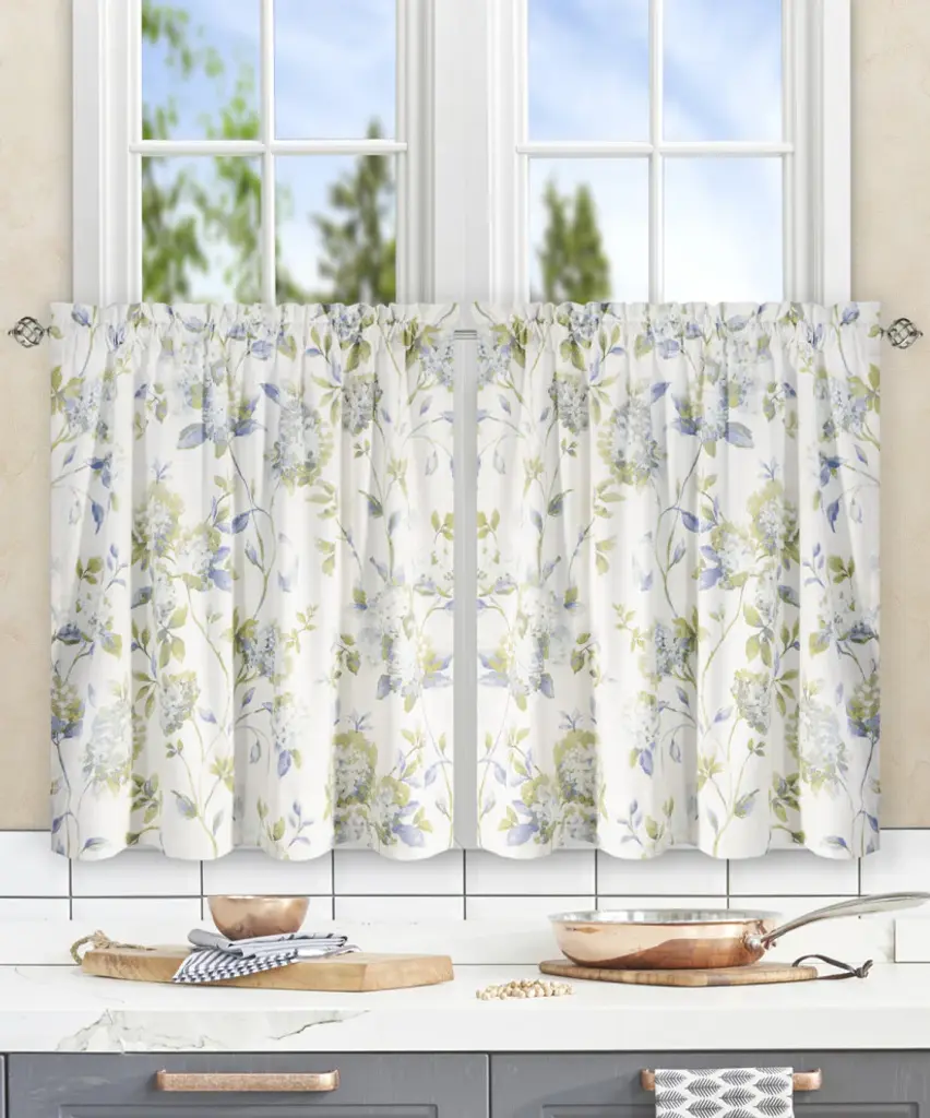 Bring the gorgeous sights of Spring indoors. Our traditional hydrangea pattern on high quality fabric will drape beautifully and bring a breath of fresh air into the entire room. Abigail is a multi colored traditional Hydrangea floral print pattern on solid natural colored ground that features a range of shades and colors that coordinate easily with a variety of solids and patterns within your home. Made with 52-percent polyester/48-percent 5-ounce cotton fabric creates a smooth draping effect, soft texture and easy maintenance.Tailored Tier curtains are used to cover the lower portion of your windows or used alone on shorter length windows. Each curtain panel is constructed with a 1.5-inch rod pocket, 1-inch header, and 3-inch bottom hem. Sold in pairs (2 Panels) Width is measured overall 56-inches per pair of panels (both 28-inch panels together) Length is measured overall 36-inches from header top (ruffle above the rod pocket) to bottom of panel. For wider windows simply add multiple panels together. Abigail Tailored Tier Curtains can be combined with a choice of 3 matching Abigail Valances, Panels with Tiebacks and Shower Curtain. Machine washable.