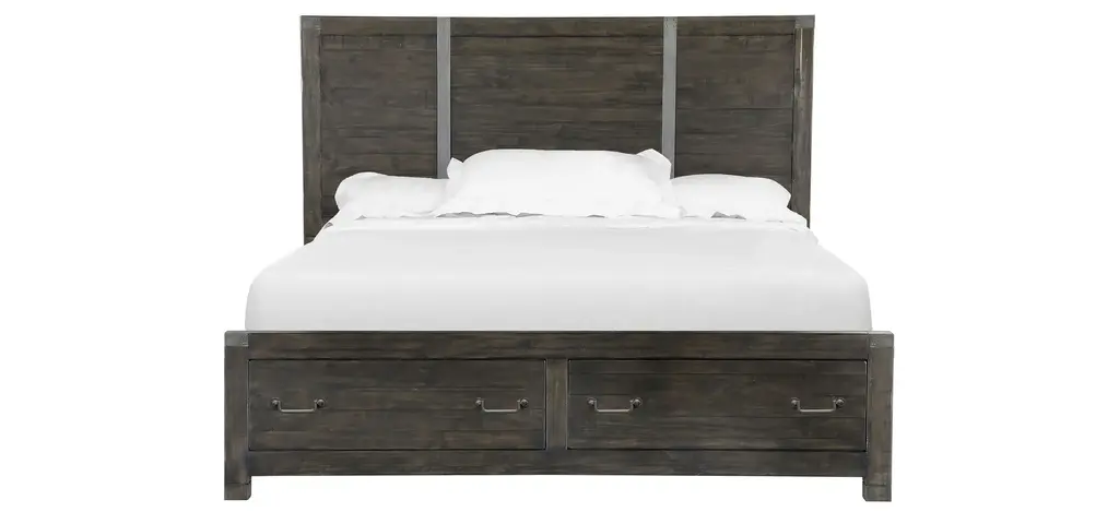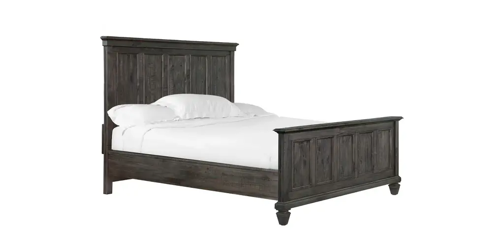 A welcoming weathered charcoal finish and rustic aged iron hardware create the hospitable allure of the Abington king panel bed. In rustic solid pine frame material, this hardworking bed is chock full of unique details. Rustic enough for a loft or retreat, yet sophisticated enough for the uptown industrialist, this piece is an ideal choice.