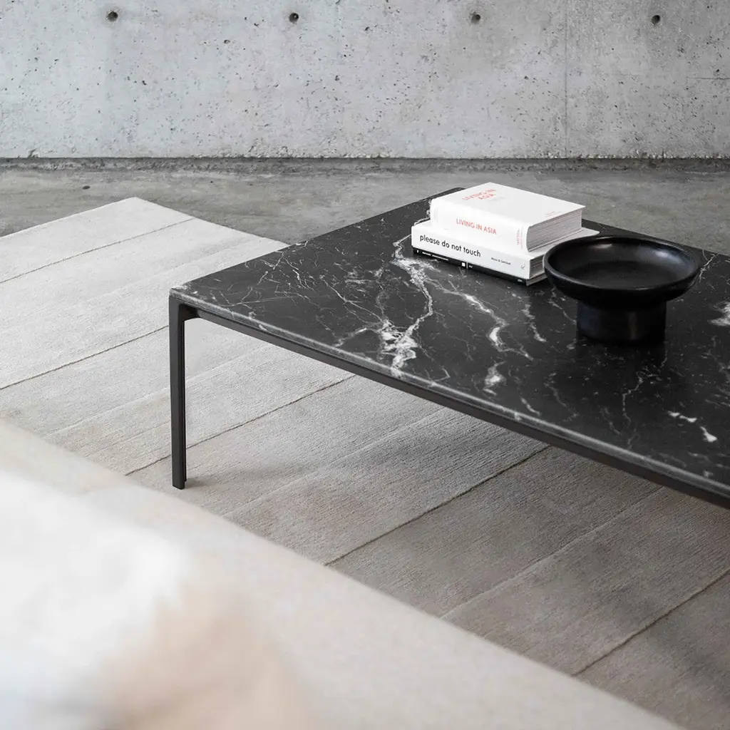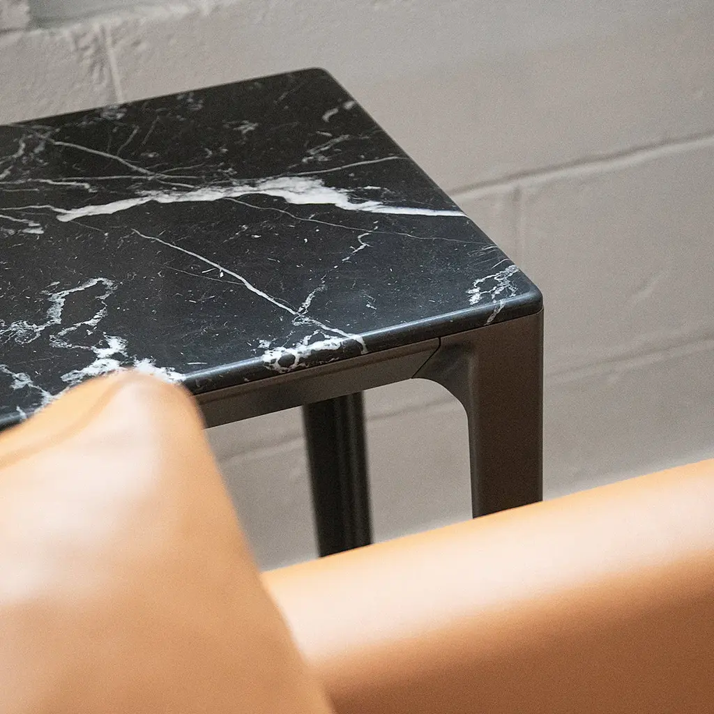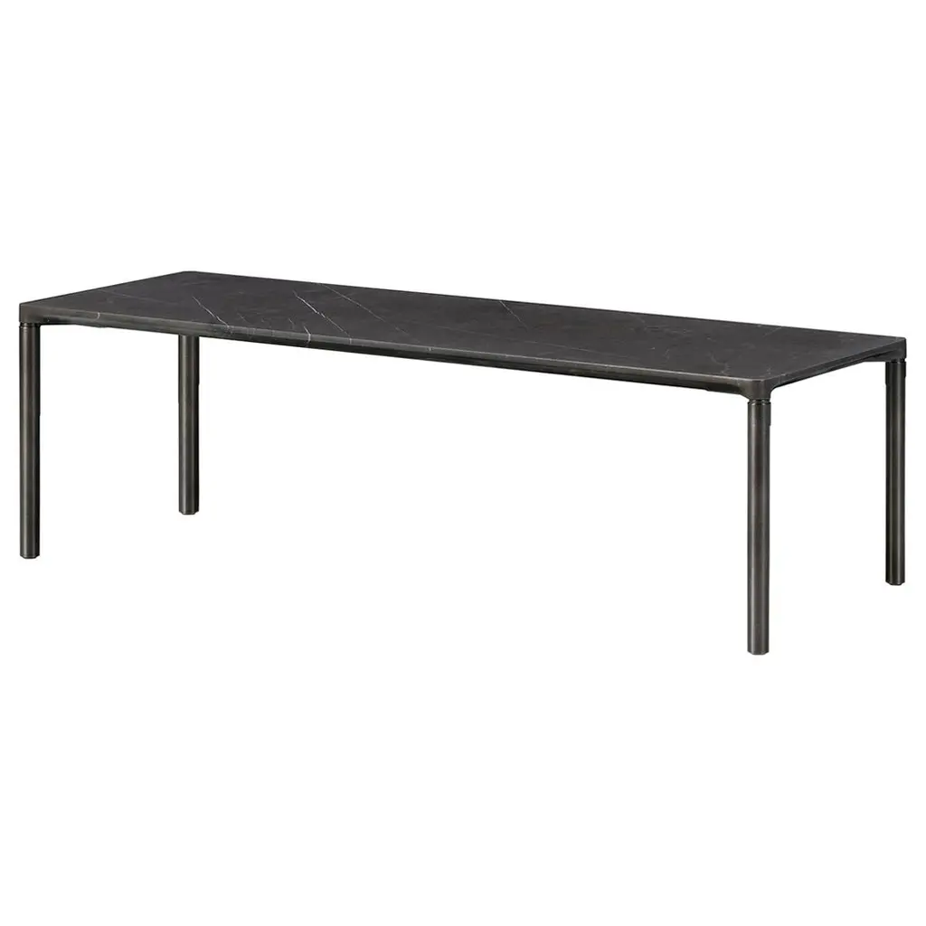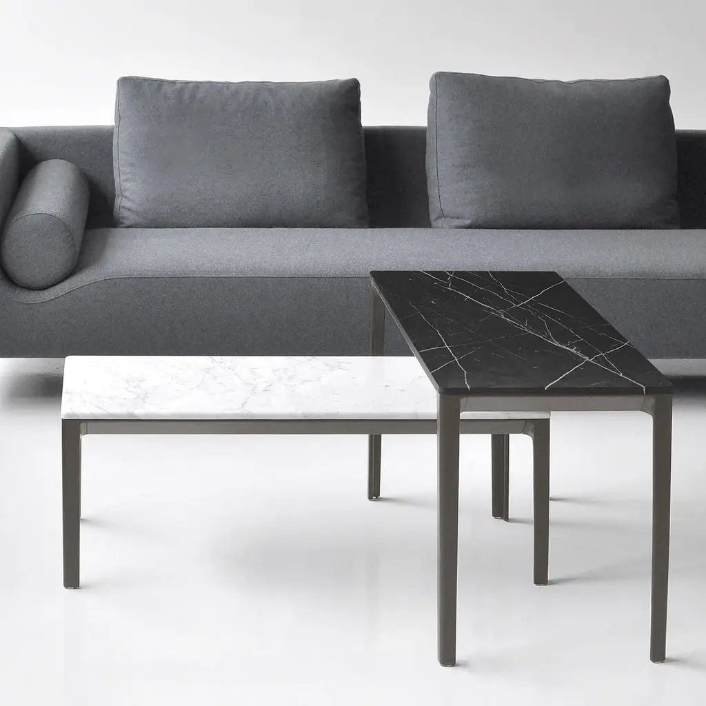 A console that doesn't overpower its surroundings, Able lends a sense of visual lightness to and sleek finesse to a room. Available in 4 sizes, there's one to fit every space. Complementing the beveled-edge tabletop, the curving frame is fashioned in cast aluminum with a subtle graphite finish. Remarkably lightweight but impressively sturdy, the console is available with its top surface in a choice of wood, marble and Polaris laminate.