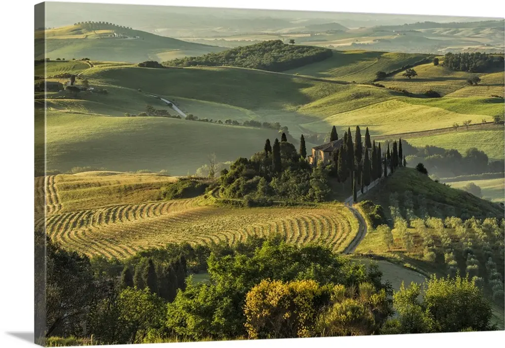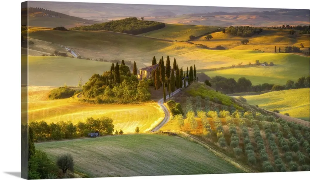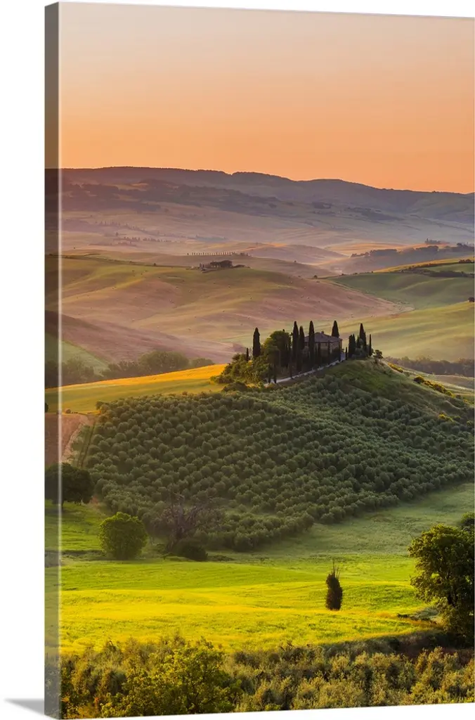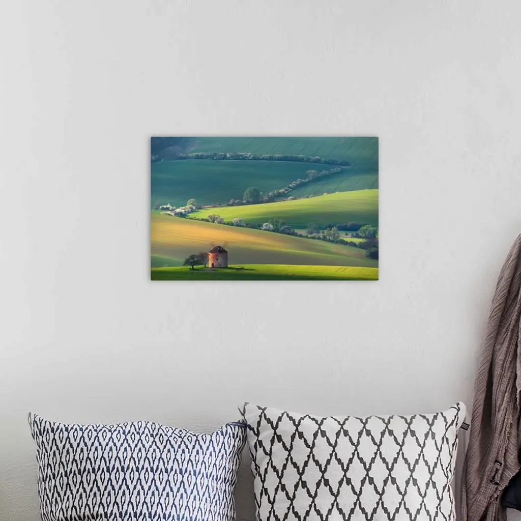 Rural summer landscape with an old windmill and white flowering trees. Beautiful sunset above the ancient windmill on the green wavy field of wheat. European medieval tower windmill on the green hill in a sunny day. Czech.