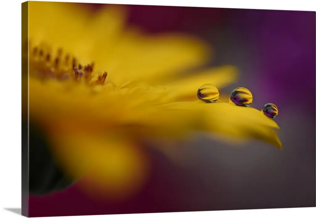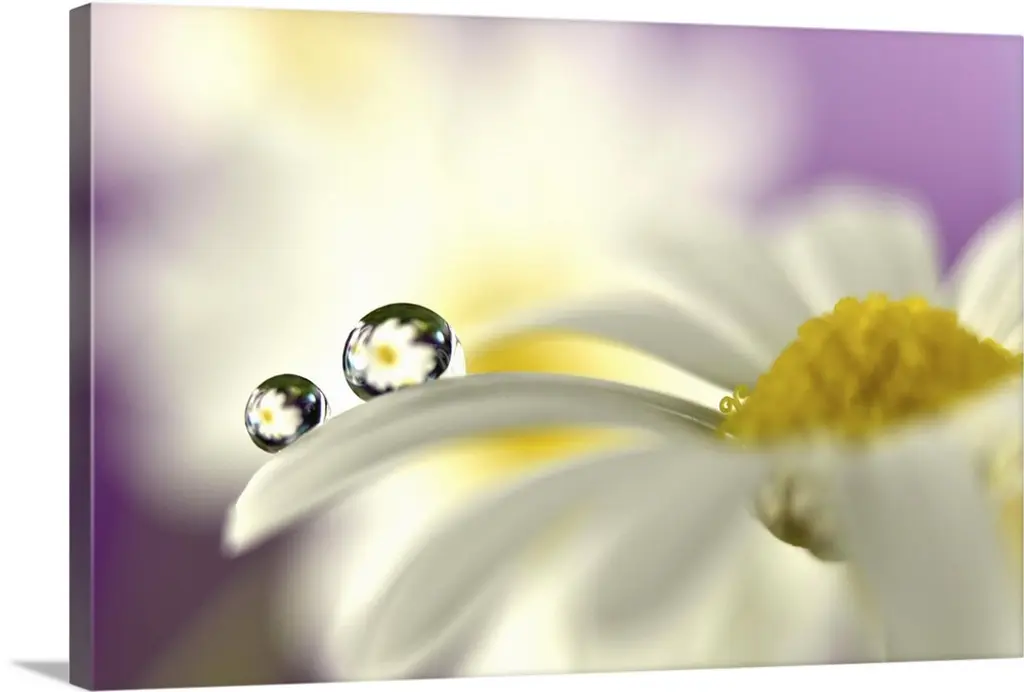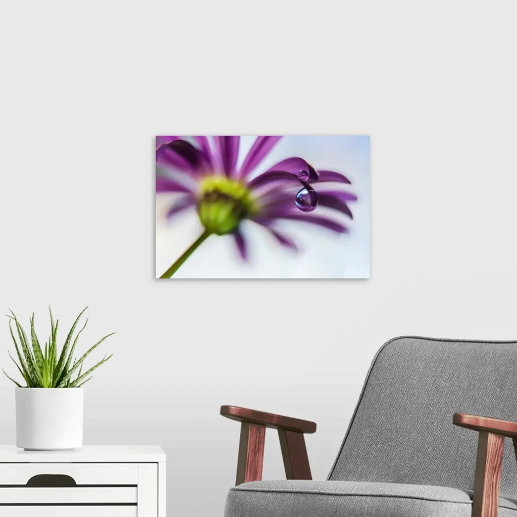 Macro photograph of a water droplet on a purple flower petal with a shallow depth of field.
