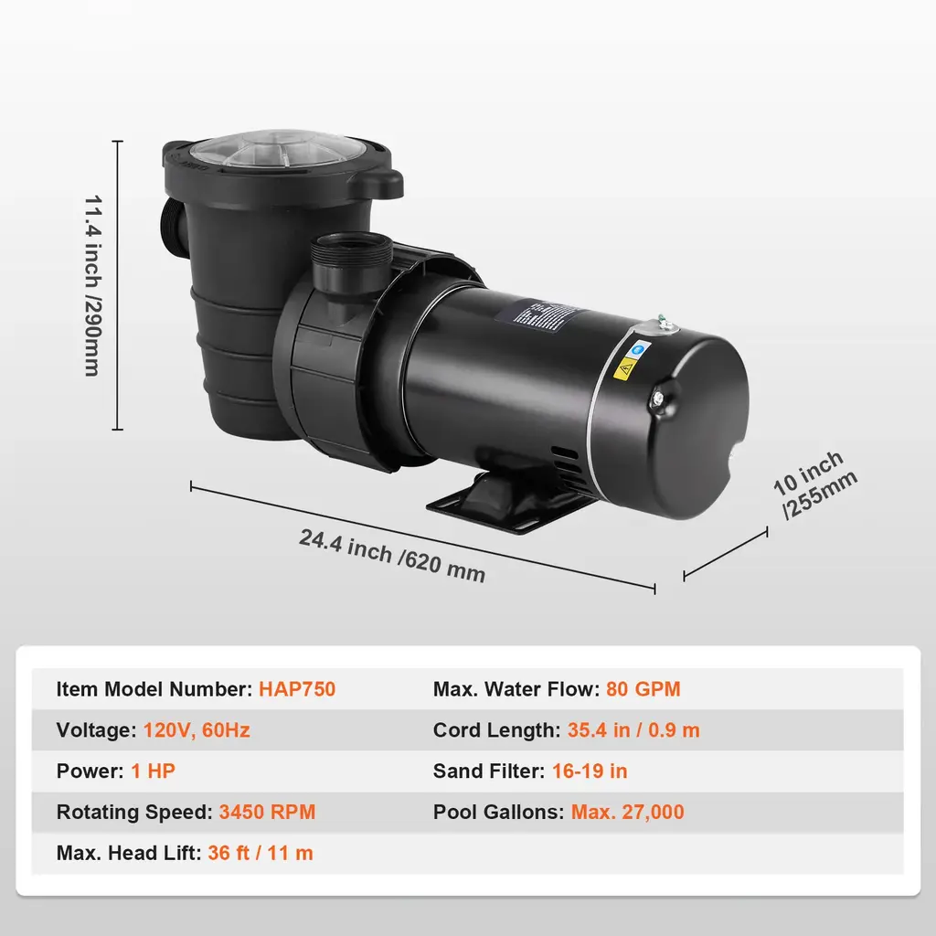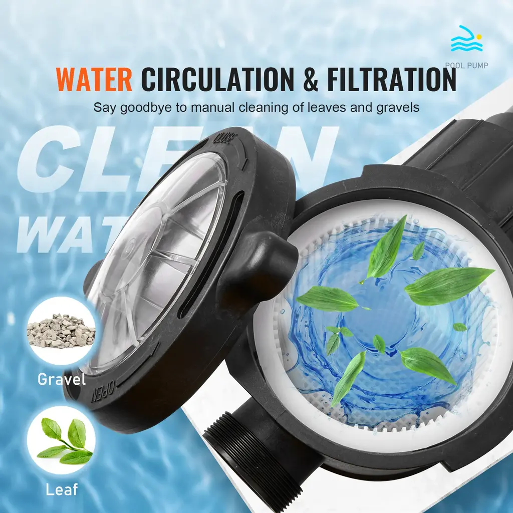 2/1 HP Premium Copper Motor: With the ability to easily switch between 110 and 240V/120V, it offers unmatched versatility. Paired with an aluminum motor casing, our pure copper motor ensures efficient and stable operation while incorporating built-in thermal protection. Our above ground pool pump is the perfect choice for circulating water filtration. Say goodbye to cloudy pool water and hello to sparkling clarity with our pool pump! Corrosion-Resistant Thickened Shell: Unlike other pumps, our pool pump features a PP shell that withstands harmful substances. With its integrated structure, it boasts leak-free, wear-resistant properties, ensuring durability even when handling water treated with disinfectants. Dive into worry-free pool maintenance with our pump! Efficient Water Circulation System: With an 110 GPM/80 GPM Max. Water Flow and 59 ft /34.4 ft/36 ft Max. Head lift, our pool pump ensures rapid water circulation. Its detachable filter basket, compatible with a sand filter (not included), facilitates physical purification and keeps your pool water crystal clear. The PVC cover allows you to monitor accurately when the basket needs cleaning. Enjoy consistently pristine pool bottoms every time! Security & Quality is Our Priority: Our single-speed pool pump can ensuring you can enjoy your pool with peace of mind. We've also incorporated grounding terminals to connect to ground lines for added security assurance. Pump out the heat and enjoy our premium pump all summer long, knowing it's built to the highest security standards. Experience Unparalleled Versatility: The swimming pool pump is ideal for above-ground pools, hot tubs, spas, wellness centers, and irrigation systems. However, it should not be used with storage tanks. Elevate your summer experience with crystal-clear water, ensuring every moment spent in your pool is pure bliss. Say hello to endless enjoyment and goodbye to worries about water quality! Package Content 1 x Pool Pump 2 x Internal Thread Connectors 2 x Sliding Joint Connectors 1 x PTFE Tape 1 x User Manual