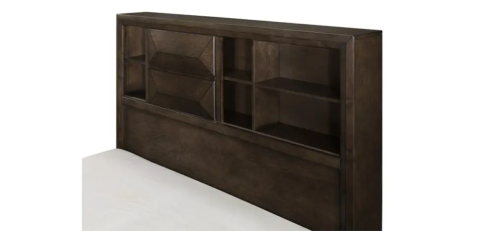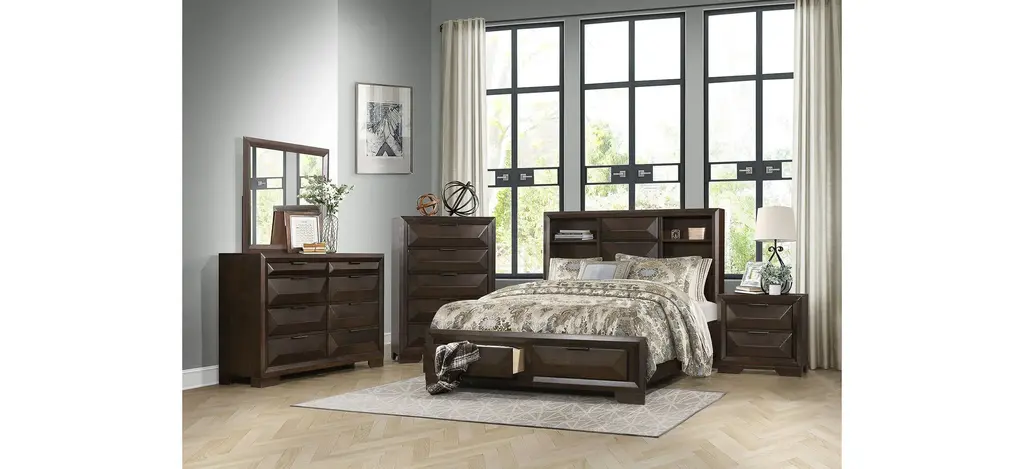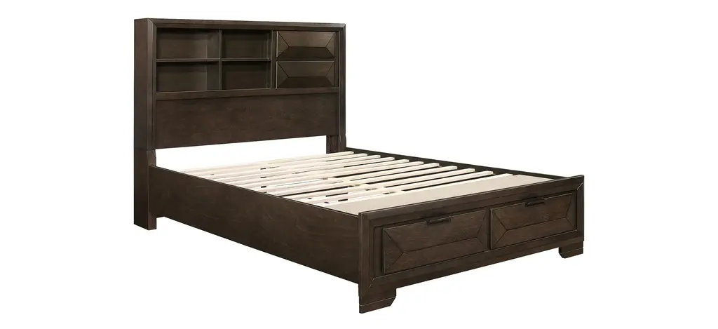 Contemporary design and convenient functionality intersect in the design of the Abraham Bed. Birch veneer is finished in a warm espresso in this unique bed offering. Raised panels provide visual interest to the drawer fronts of the headboard and footboard. The bookcase headboard provides ample storage and display space as does the storage drawer footboard.