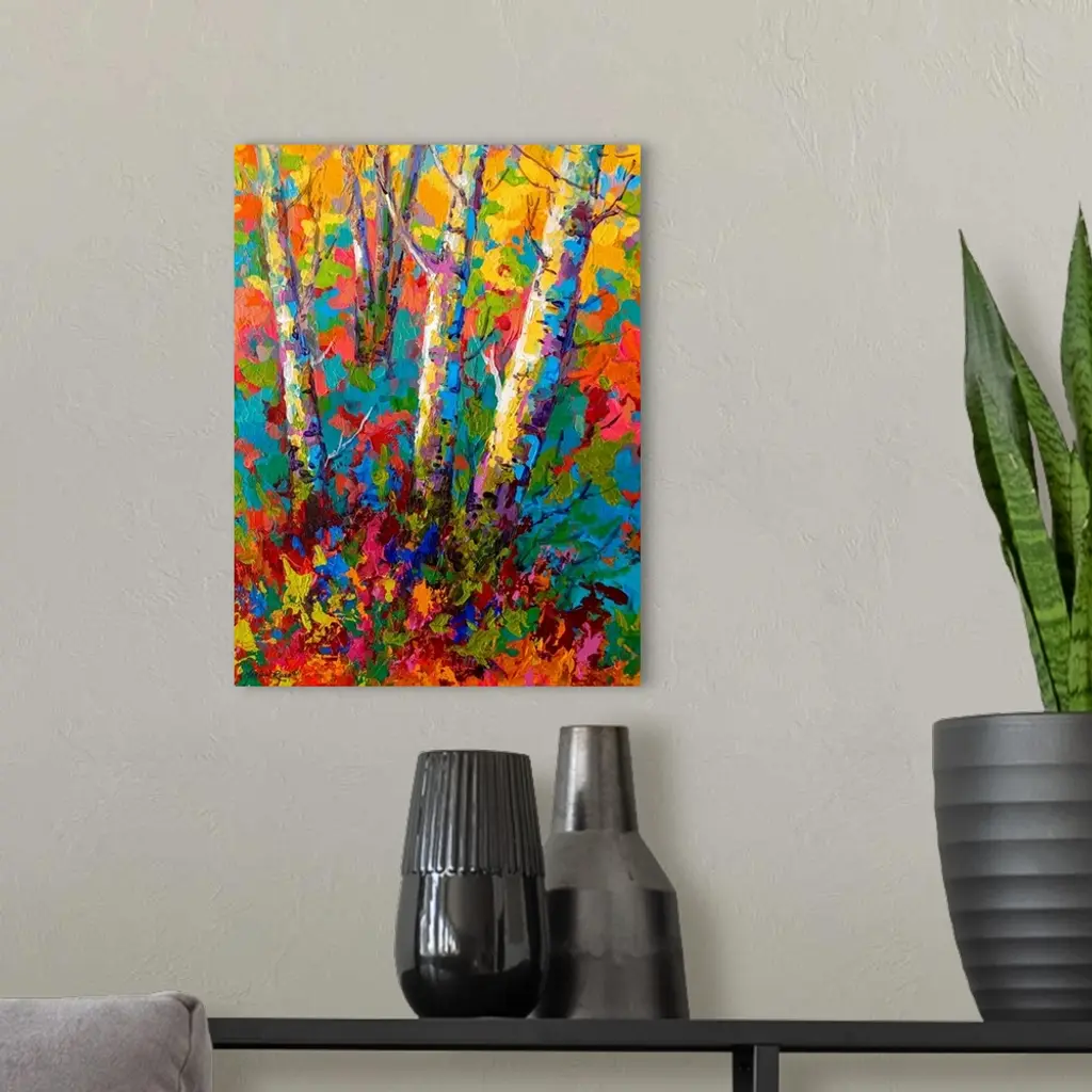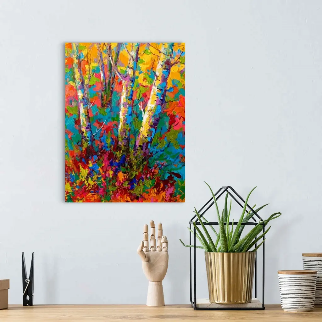 Large contemporary art depicts the bases of a few bare trees surrounded by a vibrantly colored background composed of various odd shapes, similar to the look of camouflage.