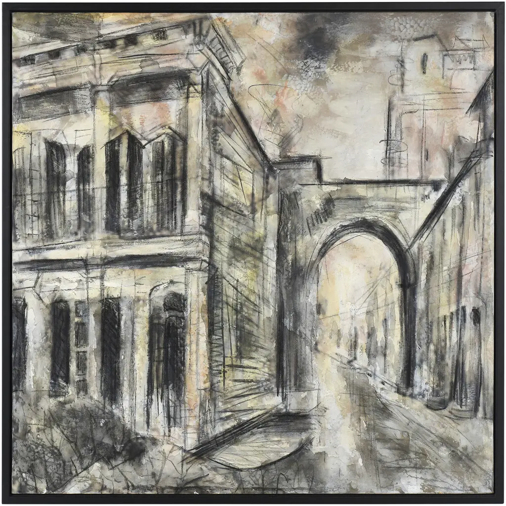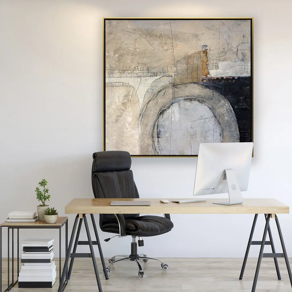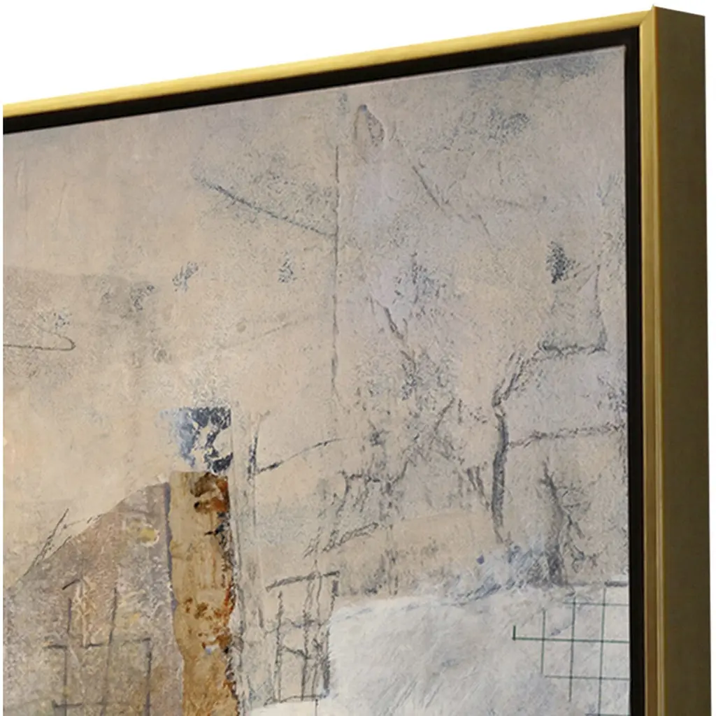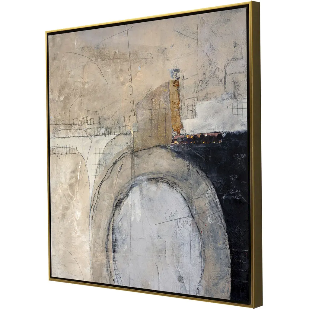 Varying shapes converge in a contemporary form. Canvas is wrapped around wood stretcher bars and mounted in an antique gold wood floater frame.