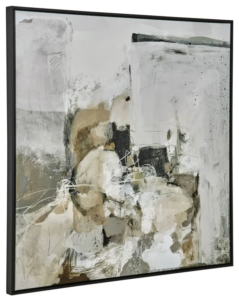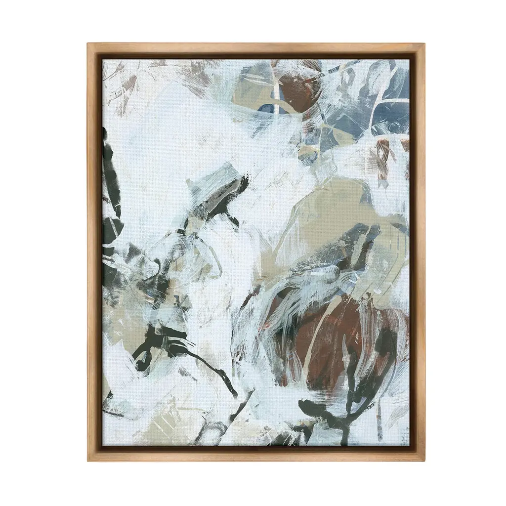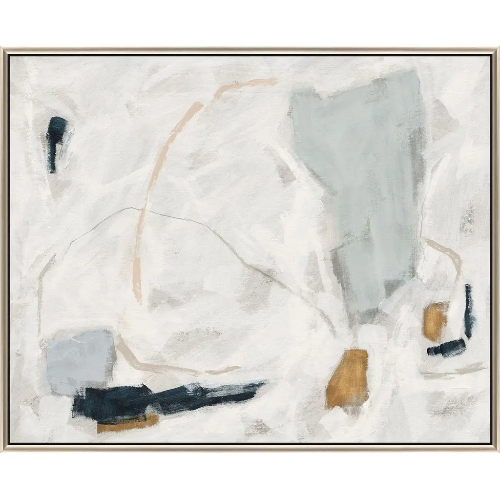 A neutral abstract canvas series has blue and beige touches of color. Canvas is mounted in a warm silver floater frame with satin black side.