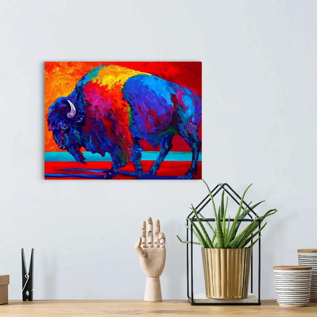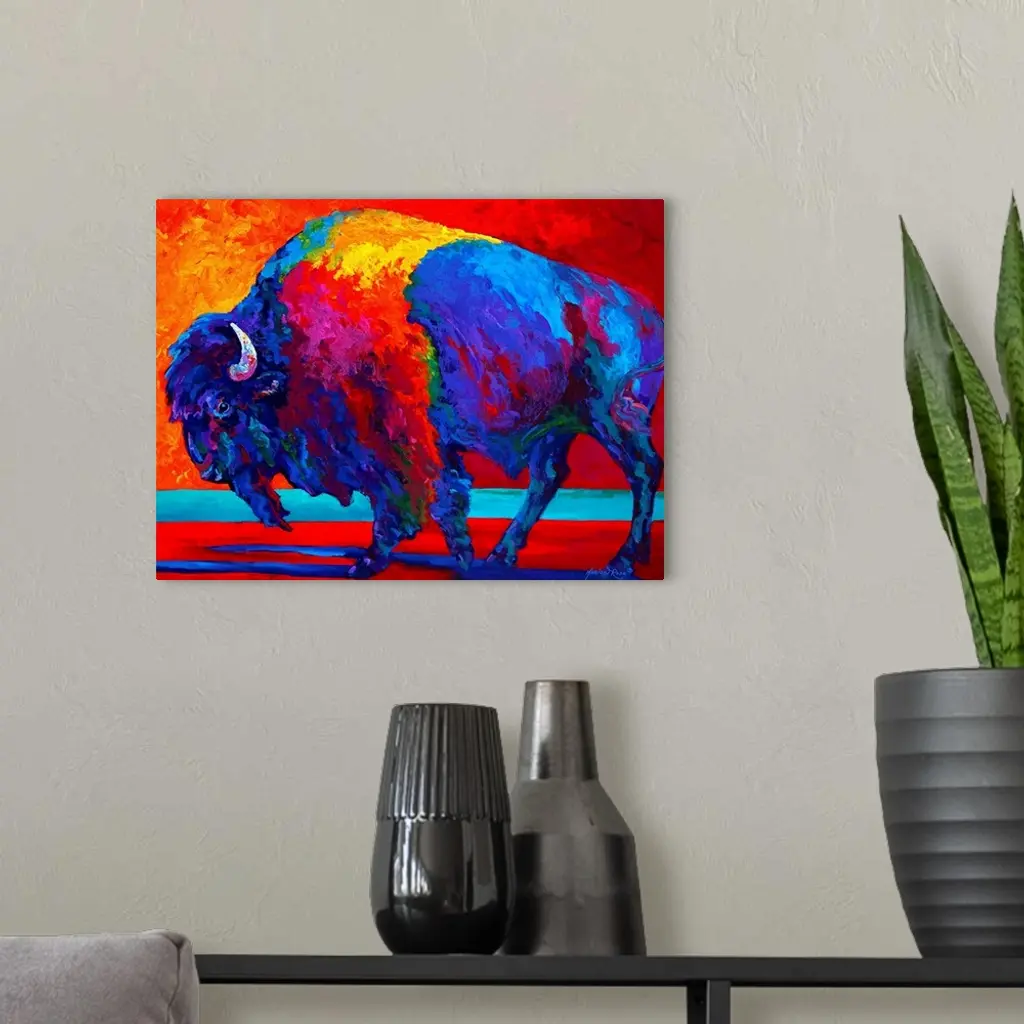 Giant contemporary art focuses on the profile of a lone humpbacked shaggy-haired wild ox through the heavy use of vibrant colors.
