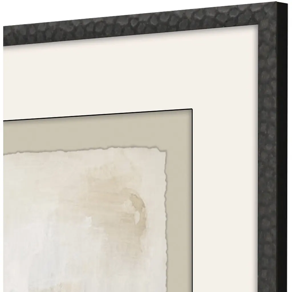 Giclee is hand deckled and float mounted with raised putty matting. Framed in a rubbed matte black wood with honeycomb embossing.