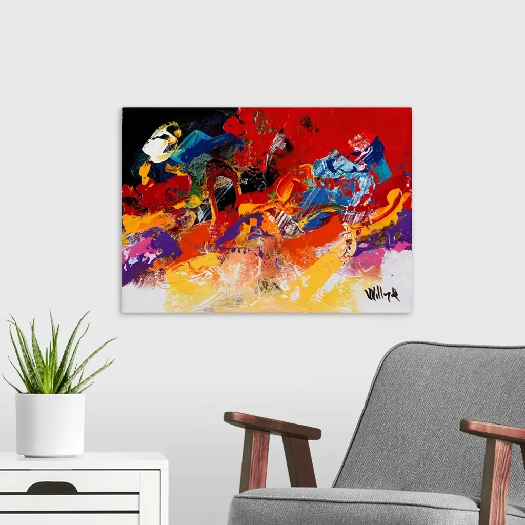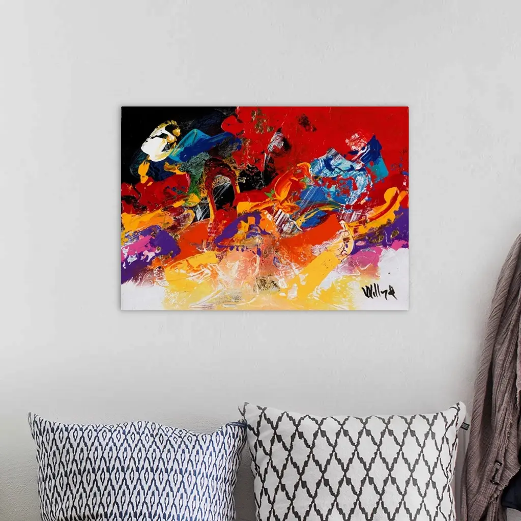 Wild, vivid abstract full of movement, with bold brushstrokes and contrasting colors.