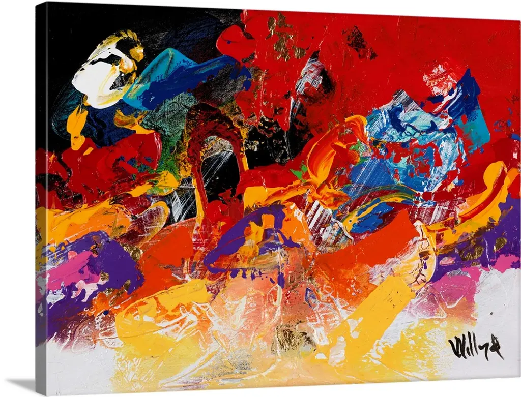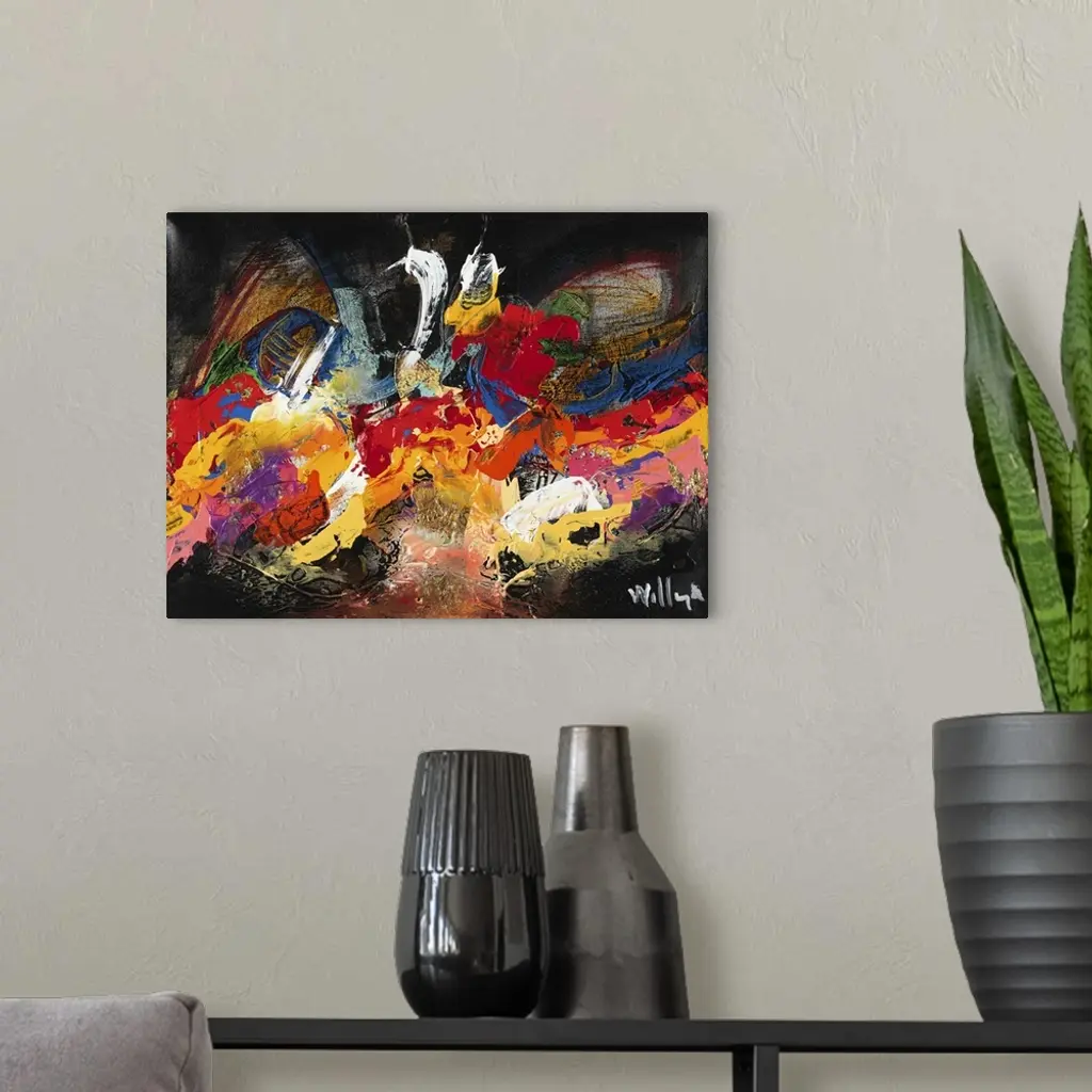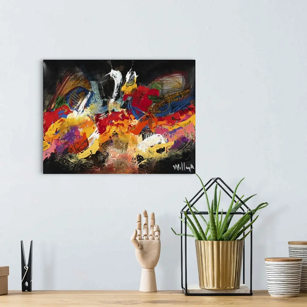 Wild, vivid abstract full of movement, with bold brushstrokes and contrasting colors.