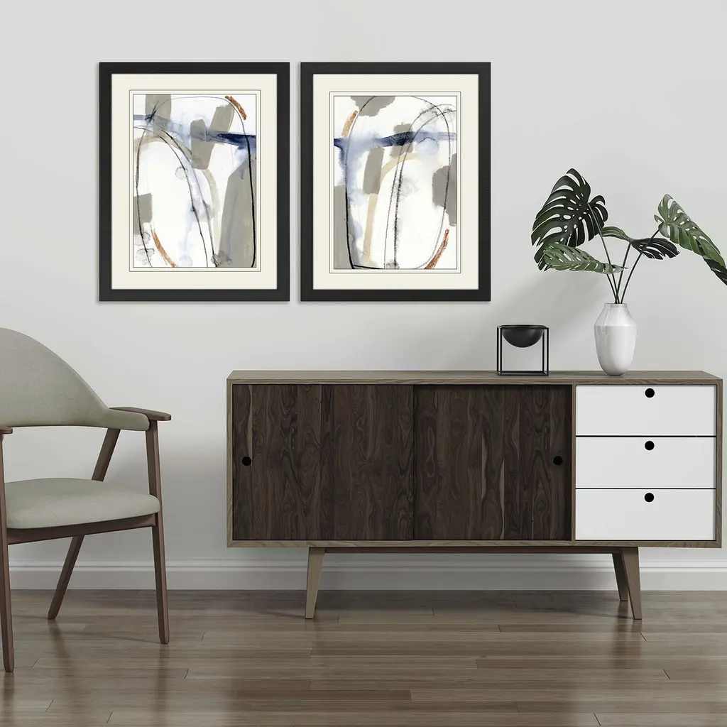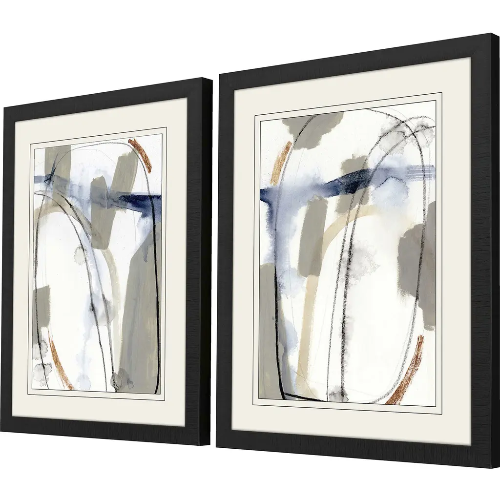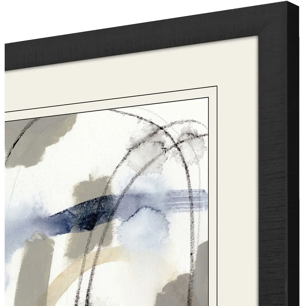 Abstract aspects converge in a modern form. Matted in white and framed in a black block contemporary moulding.