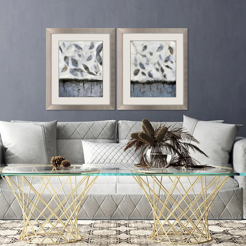 A set of two contemporary leaf images that are double matted and framed under glass. These are paired with a metallic silver frame.
