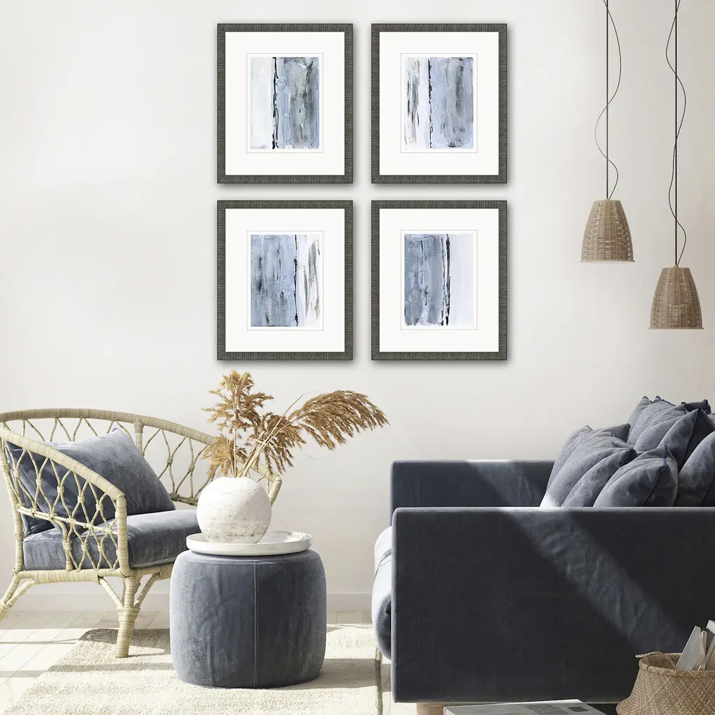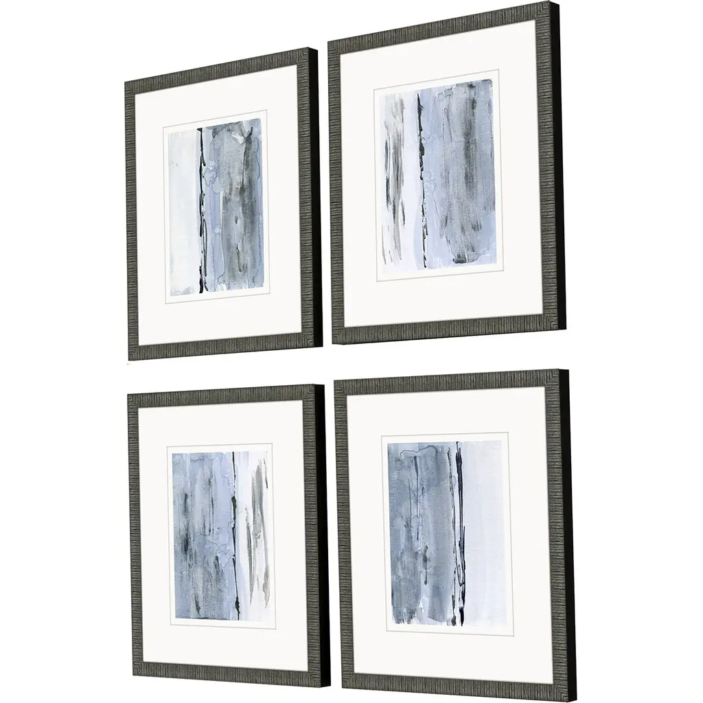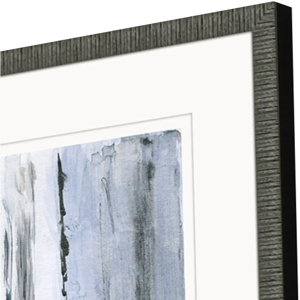 Blue abstracts are double-matted in white. Framed in a distressed black finish moulding with gray wash and black side.