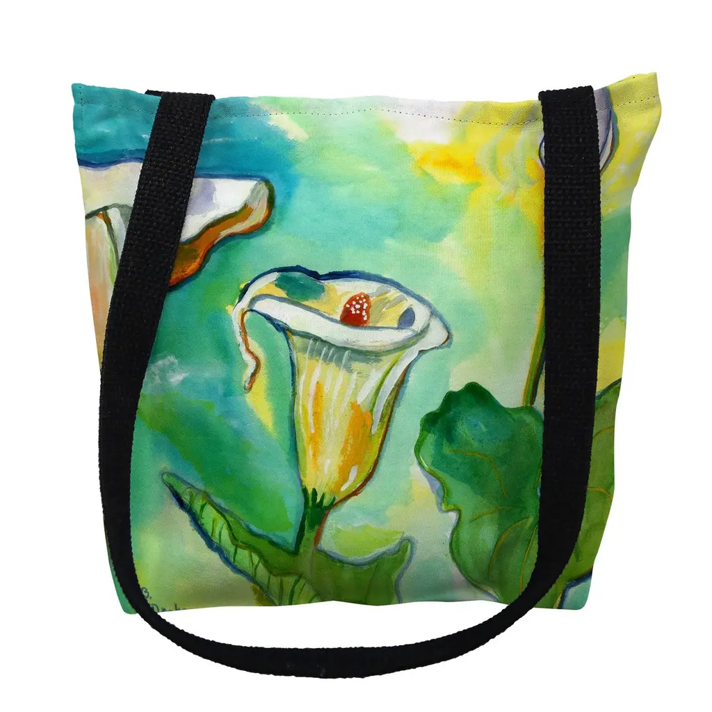 This versatile t-bottom tote bag is a great way to show your style with edge-to-edge sublimation printing in vibrant full color. The black cotton straps are soft to the touch and the exterior is water-resistant. All of our products are based on designs by artists R.B. Hamilton and Betsy Drake and are printed in the USA from imported materials. We offer three sizes: Small totes are 13x13, Medium totes are 16x16, and Large totes are 18x18.