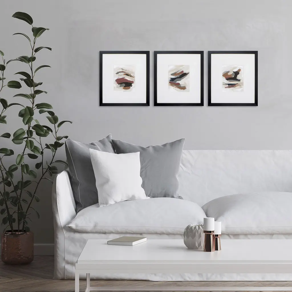 This set of abstract prints have a single mat and has been framed under glass in a sleek black moulding.