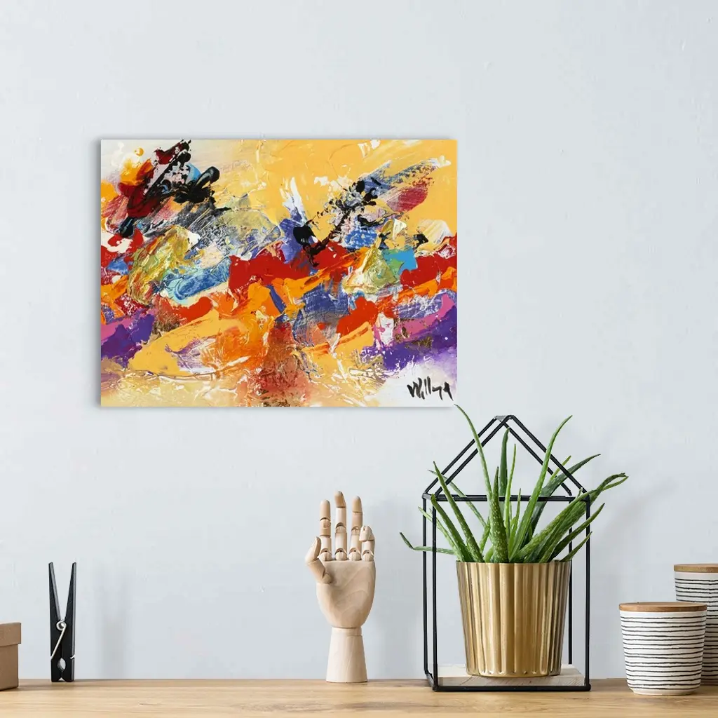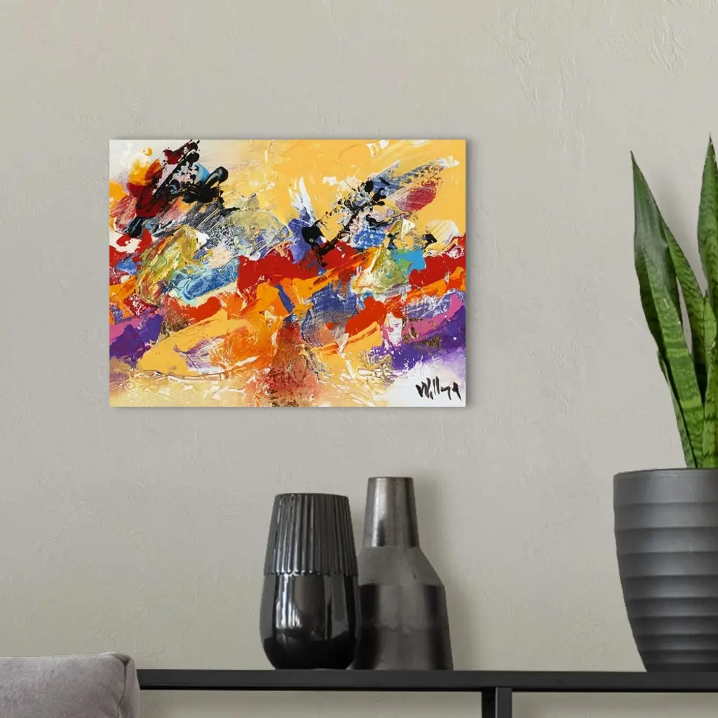 Wild, vivid abstract full of movement, with bold brushstrokes and contrasting colors.