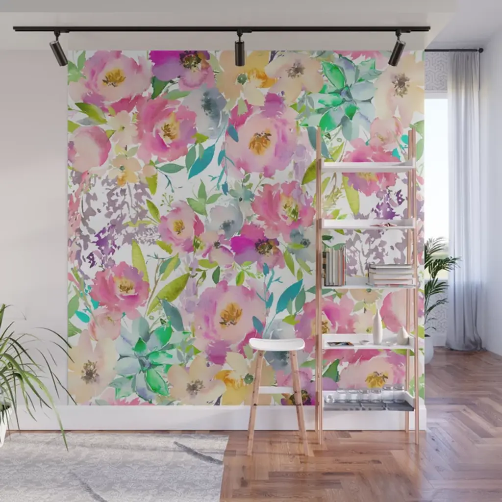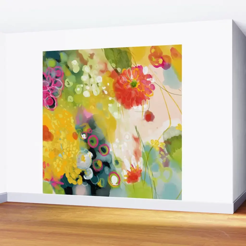 Abstract Floral Art In Yellow Green And Rose Magenta Colors Wall Mural