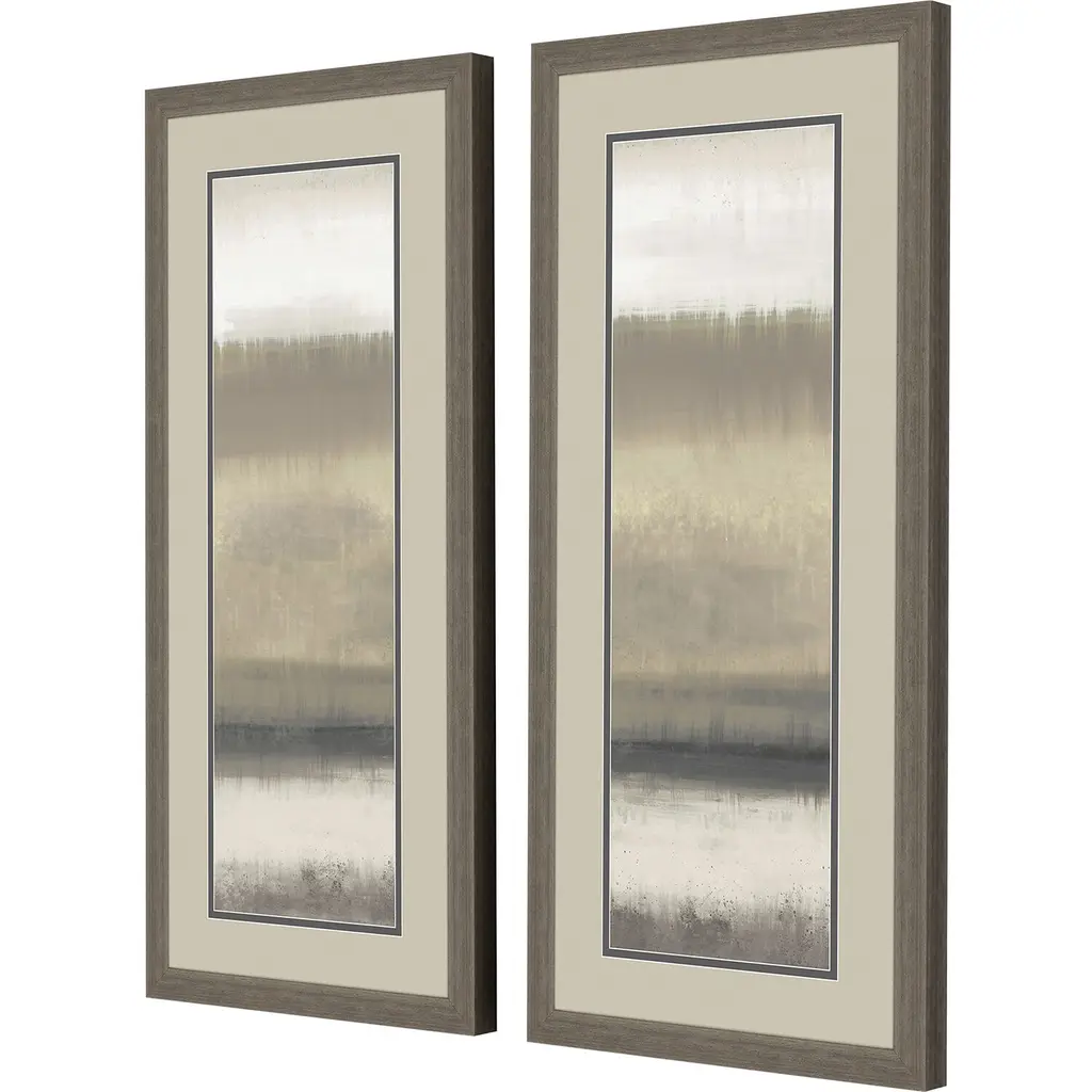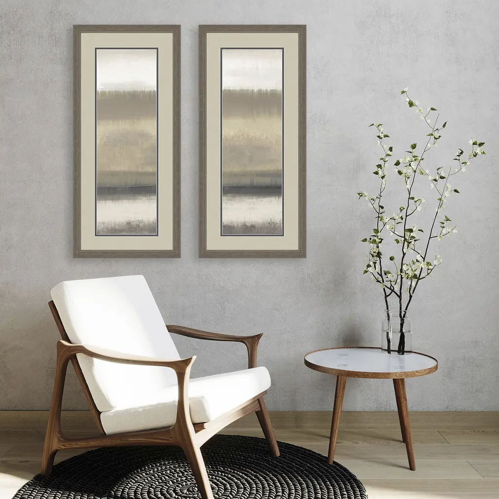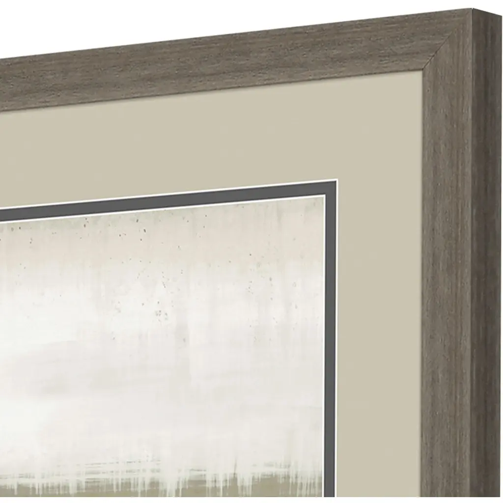 Abstract coastal panels are matted in putty and cinder. Framed in a medium wood-grain finish moulding.