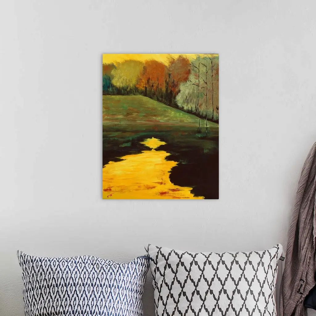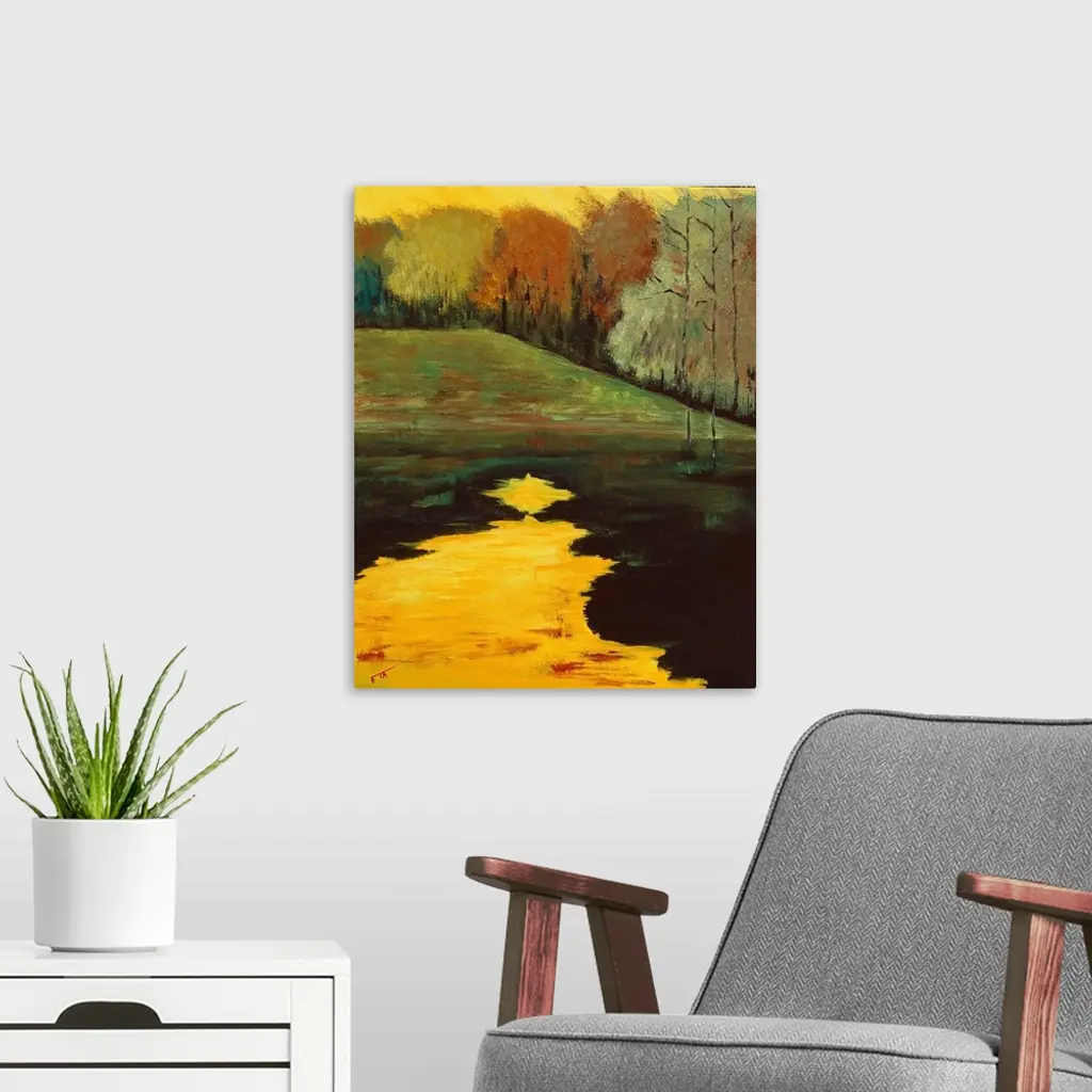 A contemporary landscape of a field and trees next to a lake in warm autumn colors.