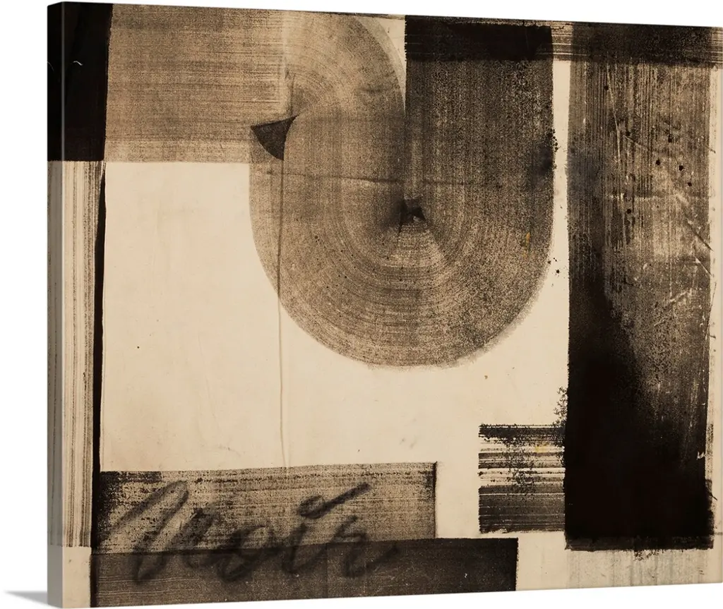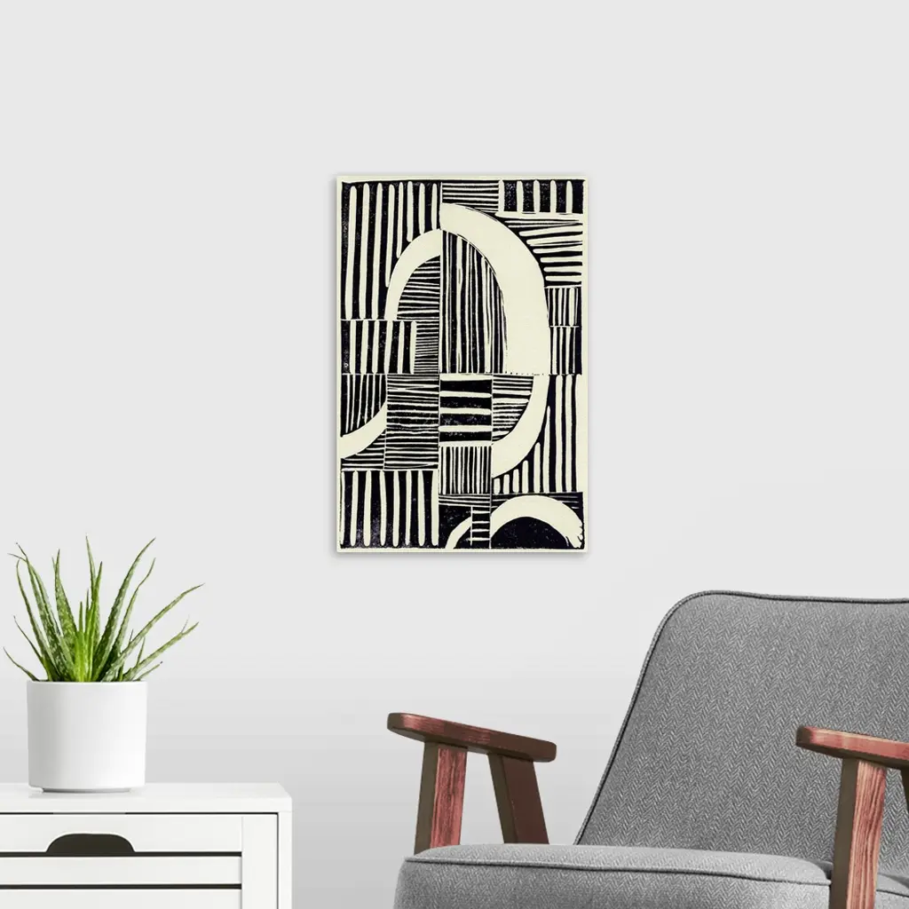 Abstract linocut print with stripes and geometric shapes.
