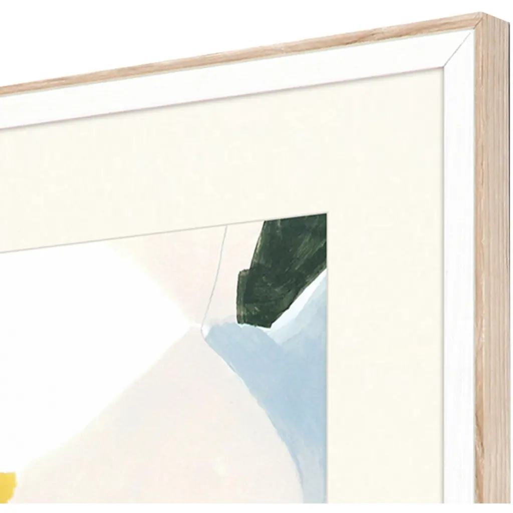 Playful abstracts are matted in white. Framed in a ribbed white wood moulding with blonde wood finish side.