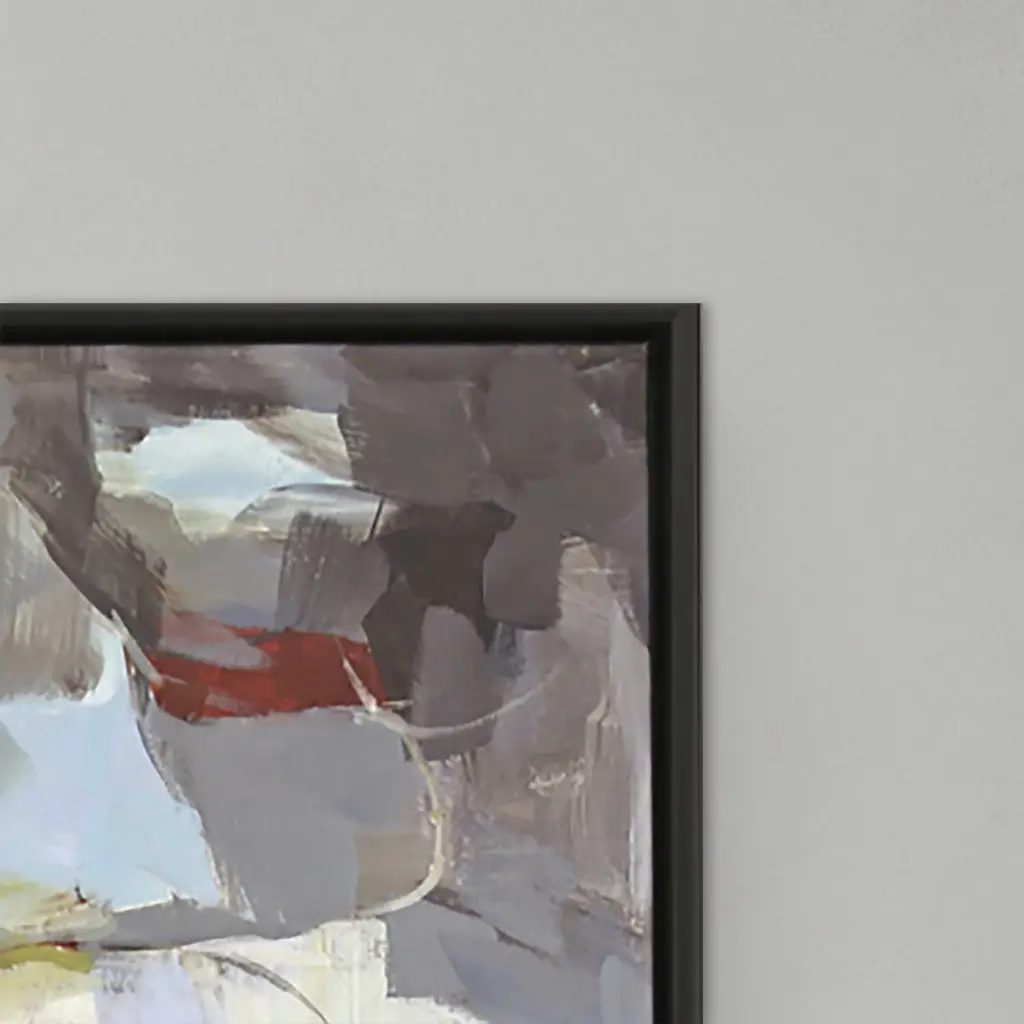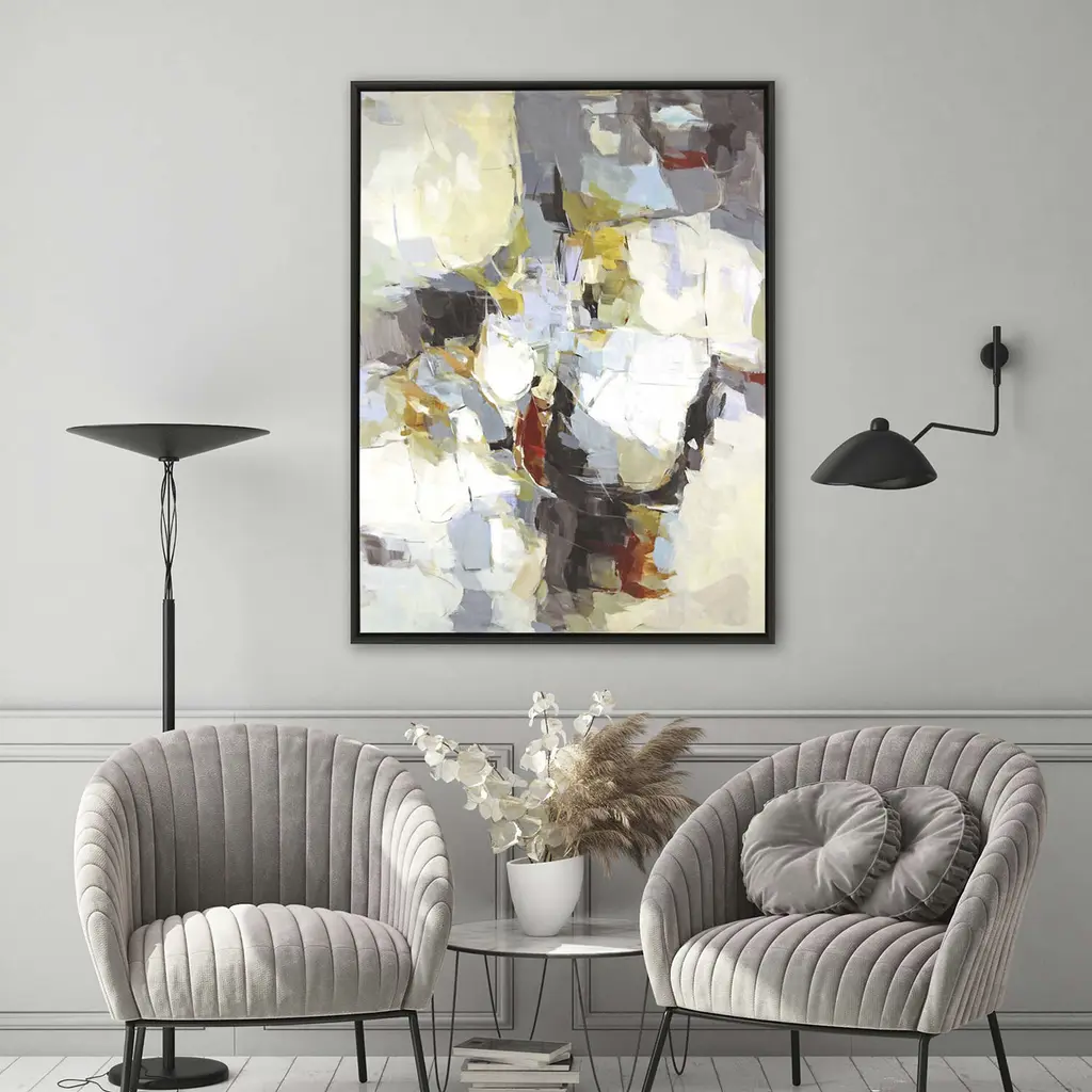 Varied colors coalesce in an abstract composition. Canvas is wrapped around wood stretcher bars and mounted in a satin black wood floater frame.