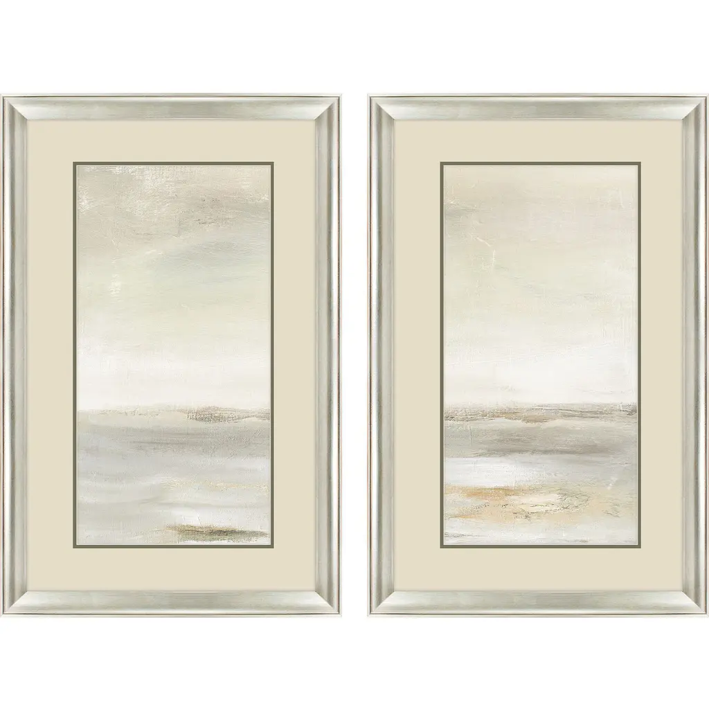 A set of two abstract seascape panels are double matted in white and moss. Framed in a modern brushed antique silver finish moulding.