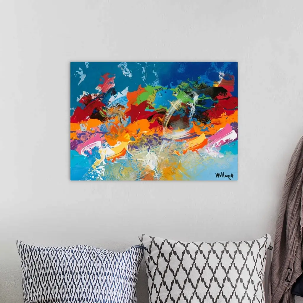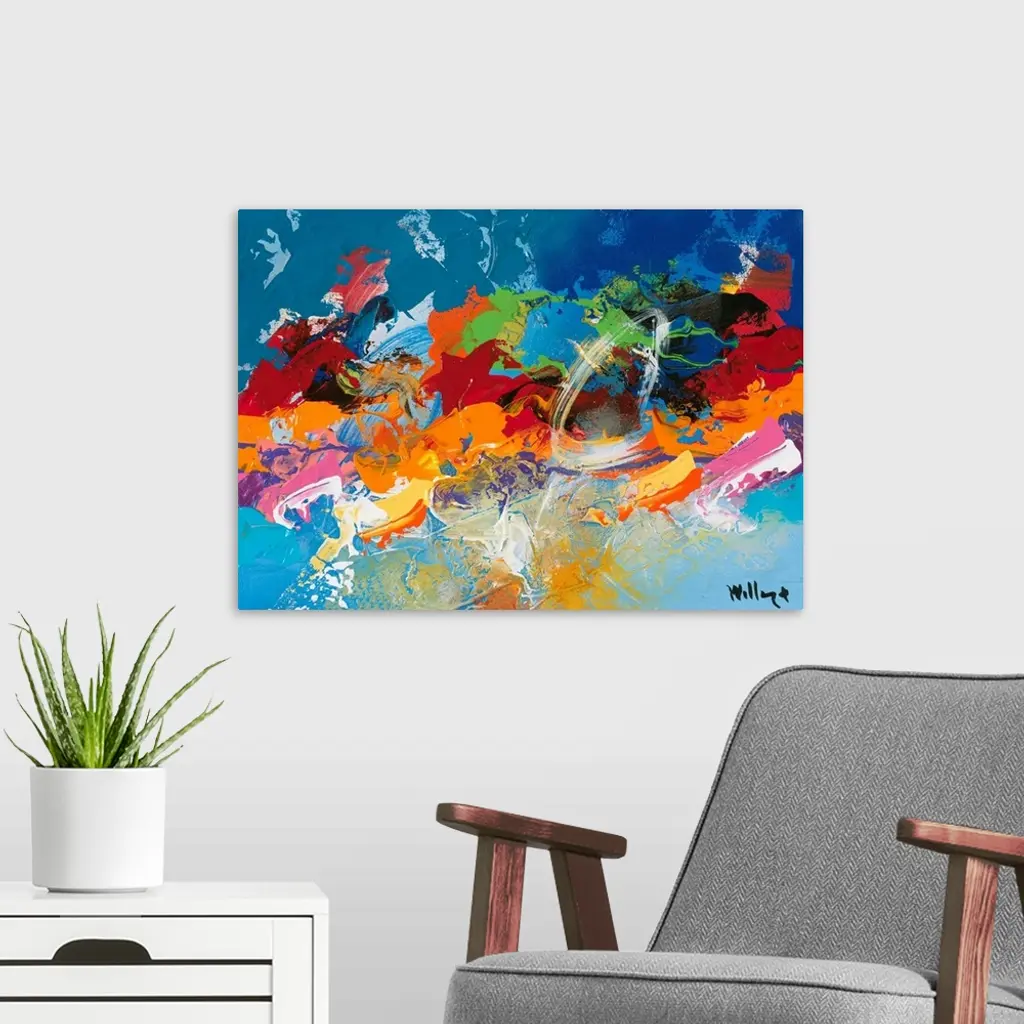 Wild, vivid abstract full of movement, with bold brushstrokes and contrasting colors.