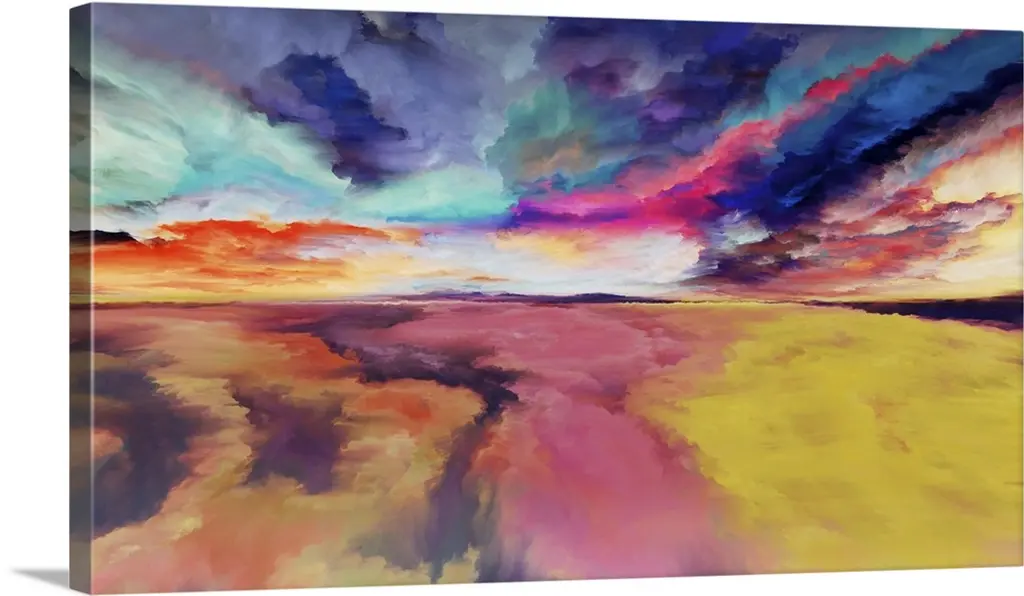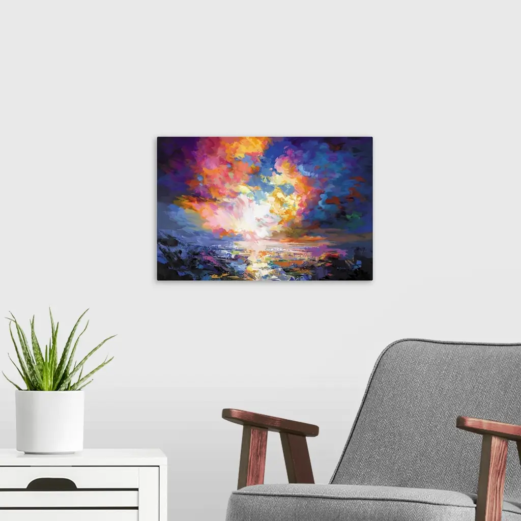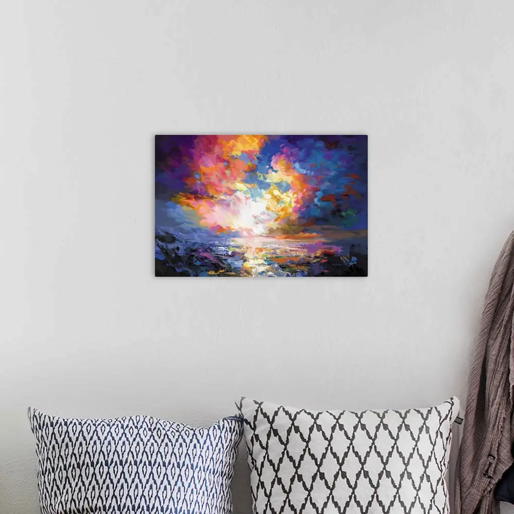 A burst of vibrant clouds stretches across the sky in this abstract modern ocean sunset by Leon Devenice, where light cascades over reflective water in waves of color. The horizon glows with warmth and motion, blending deep blues, fiery oranges, and soft pinks. This dramatic contemporary seascape captures the emotional energy of sky meeting sea.