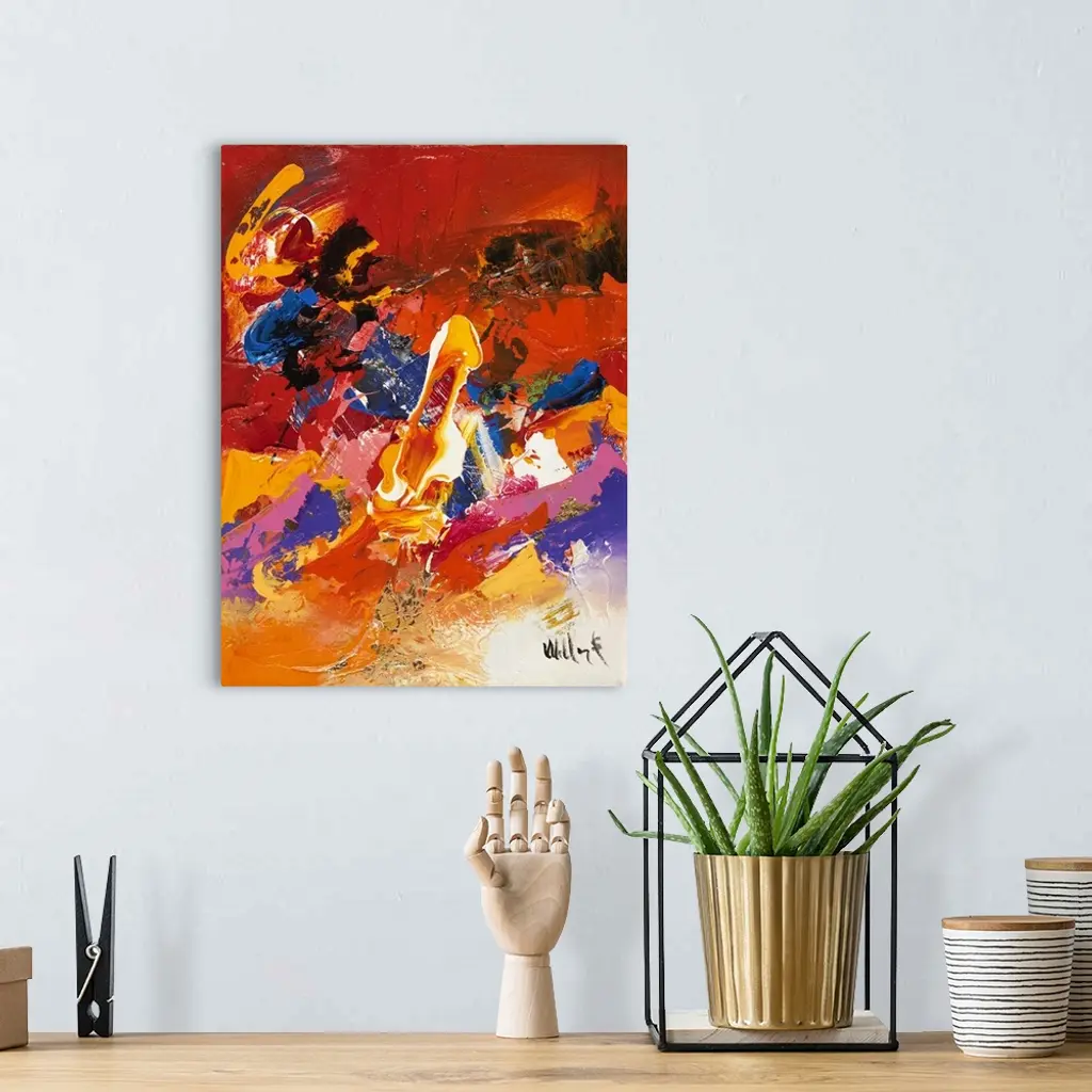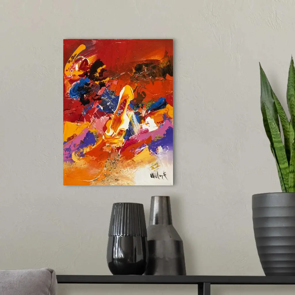 Wild, vivid abstract full of movement, with bold brushstrokes and contrasting colors.