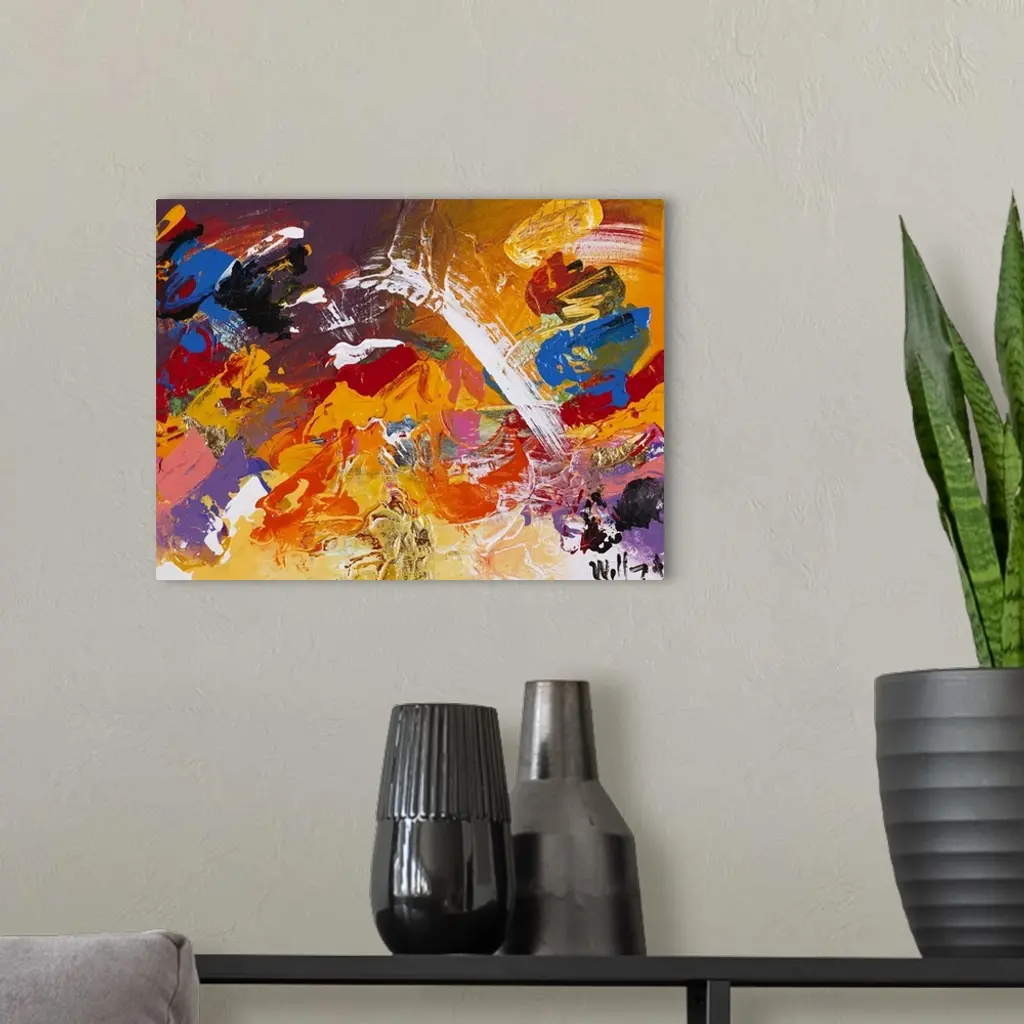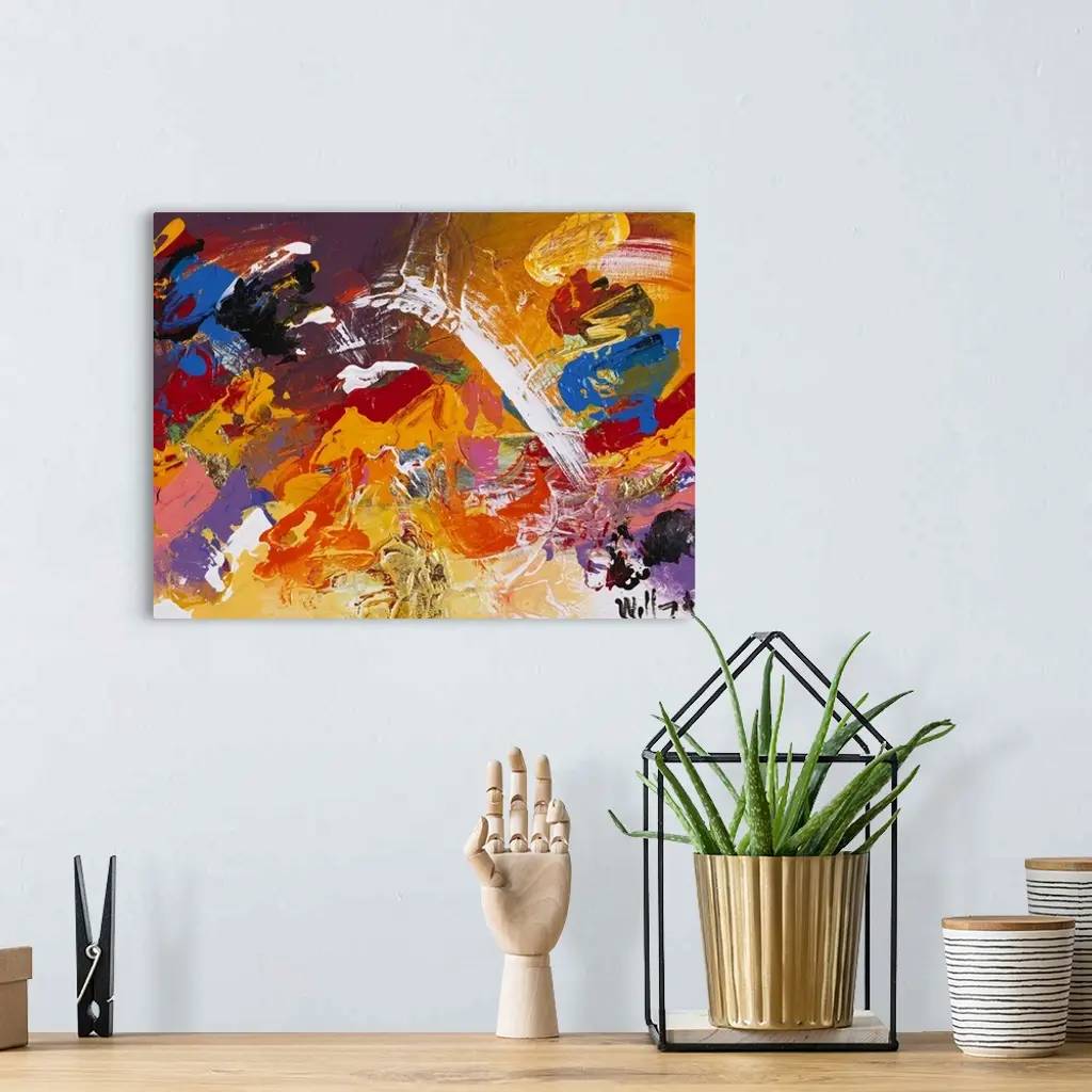 Wild, vivid abstract full of movement, with bold brushstrokes and contrasting colors.