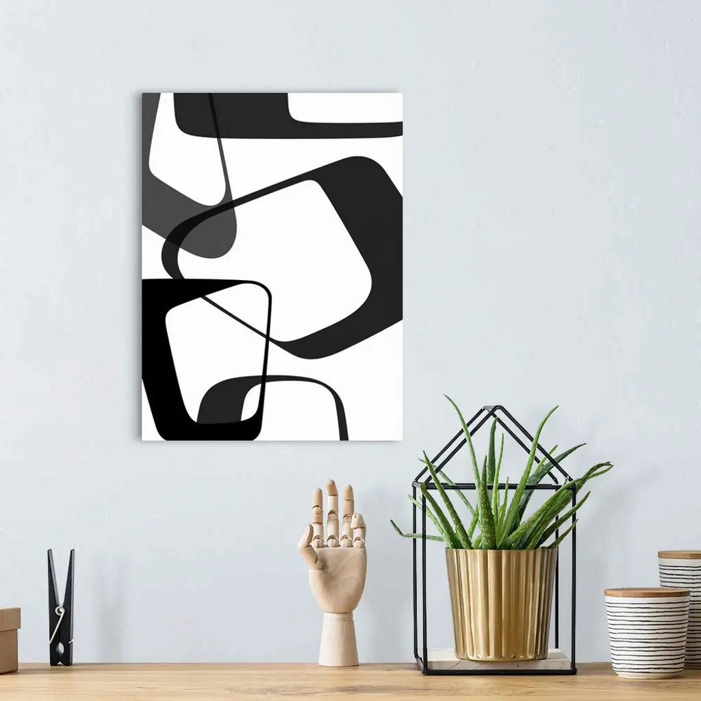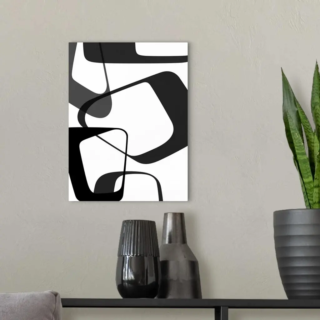 Oversized, vertical, contemporary docor wall art of large, misshapen, rounded squares overlapping on a solid white background.