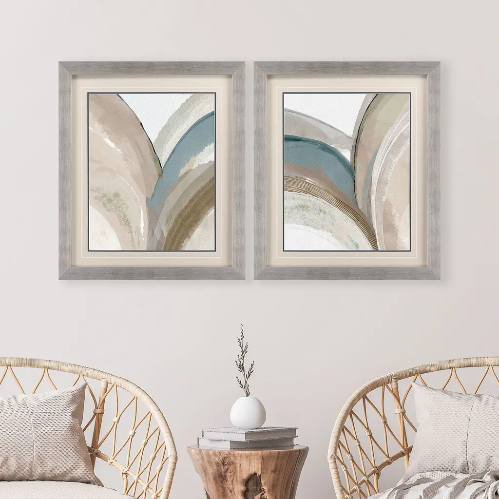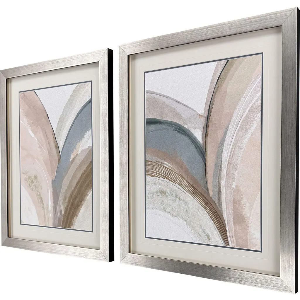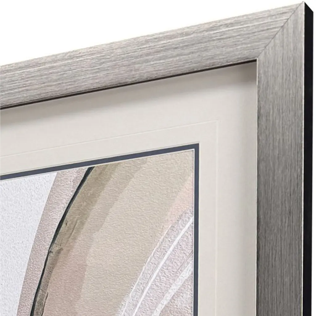 Abstract prints in blue and brown are double matted and framed in an elegant contemporary molding in a brushed silver finish with black lip.