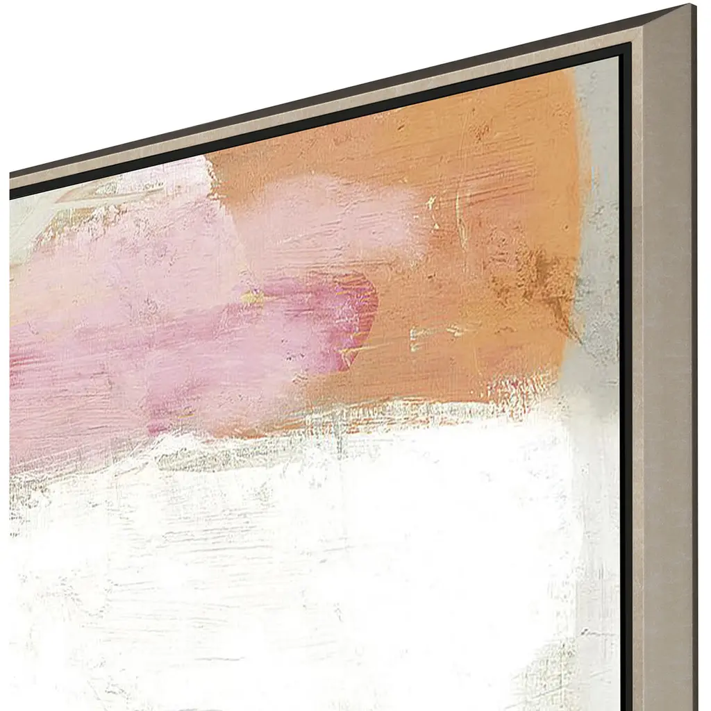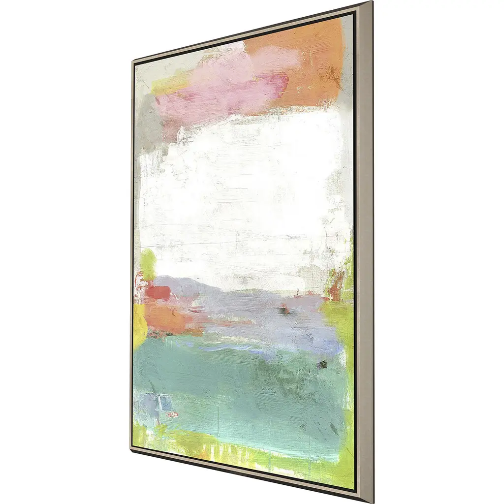 Bold brush strokes cluster in an array of color. Canvas is mounted in a champagne gold finish floater frame.