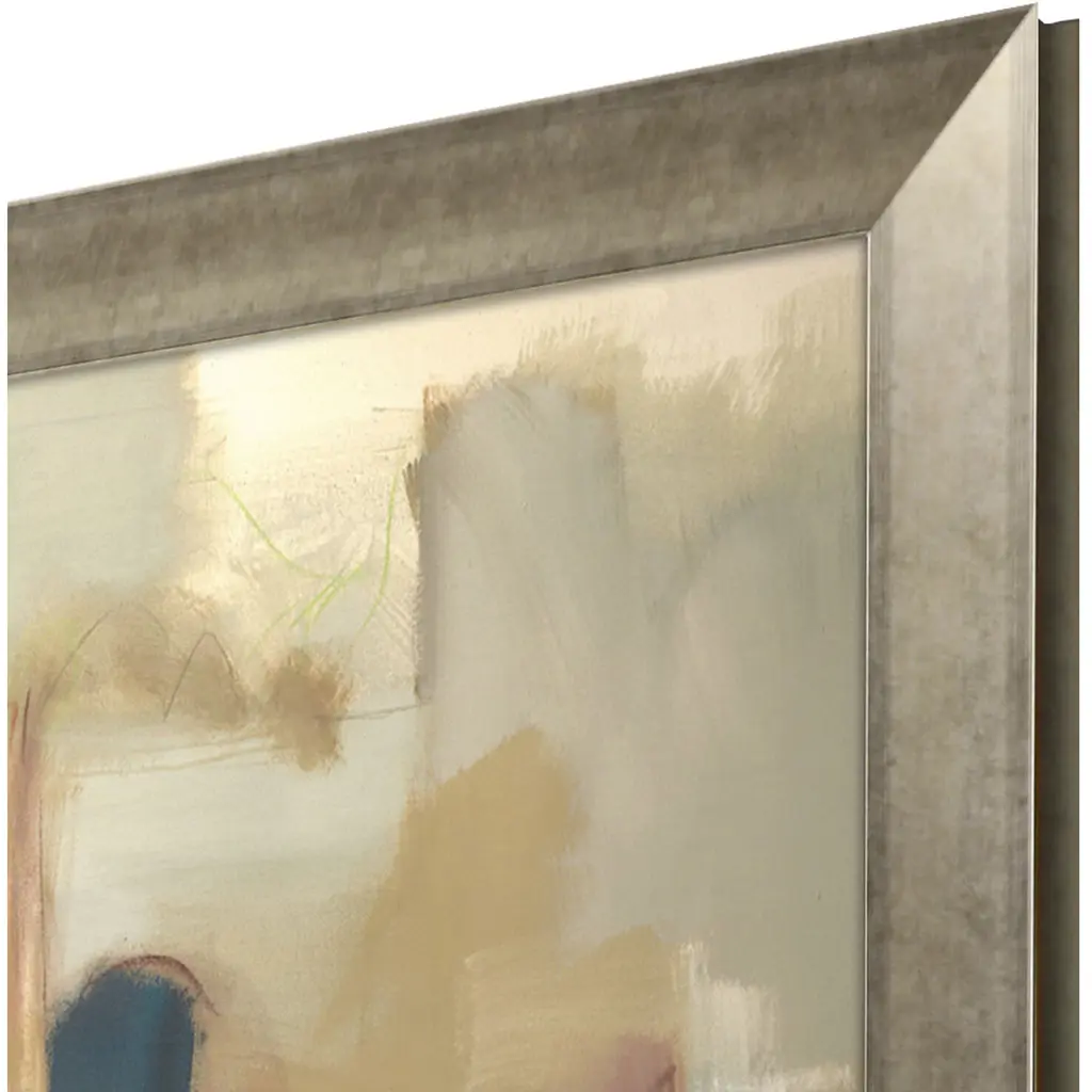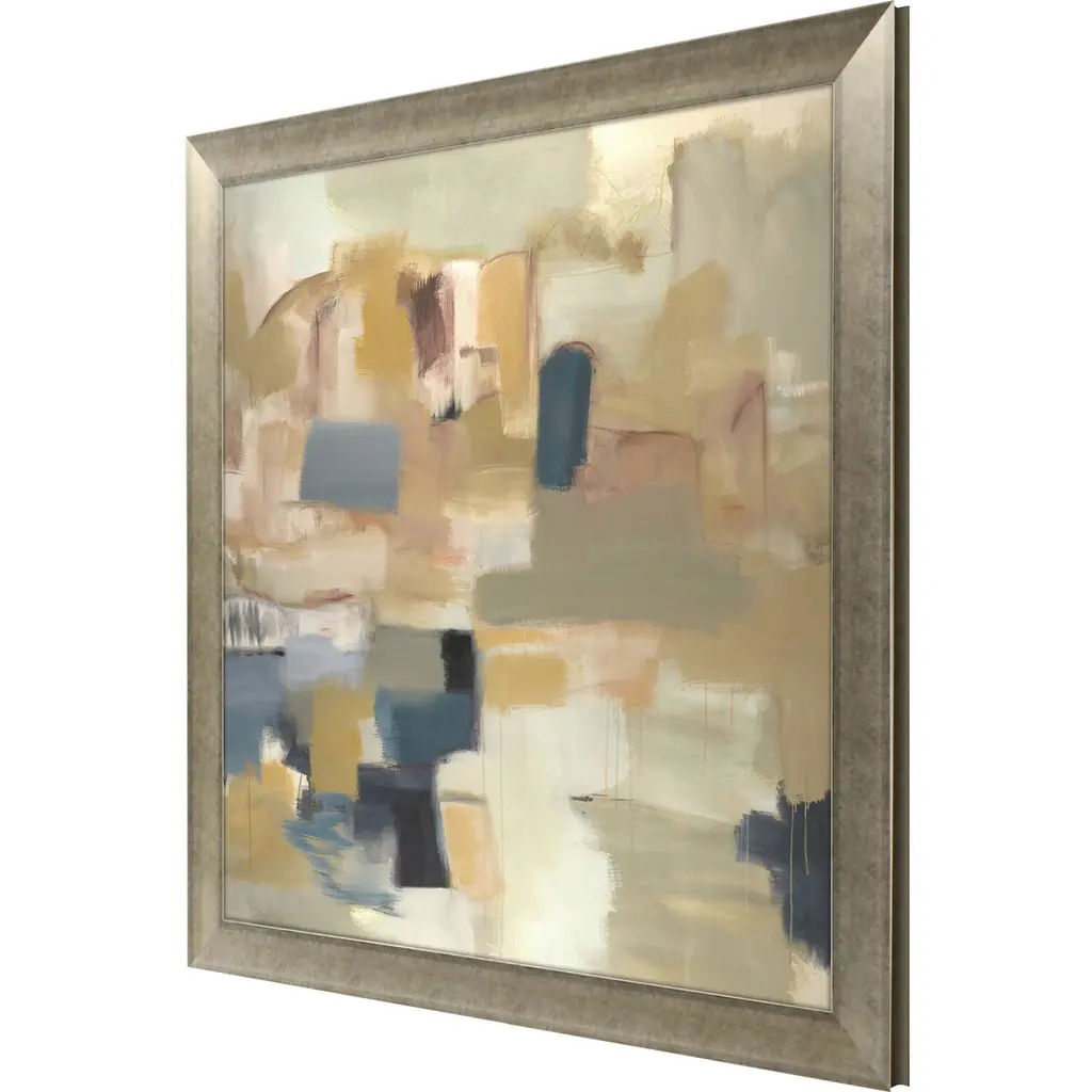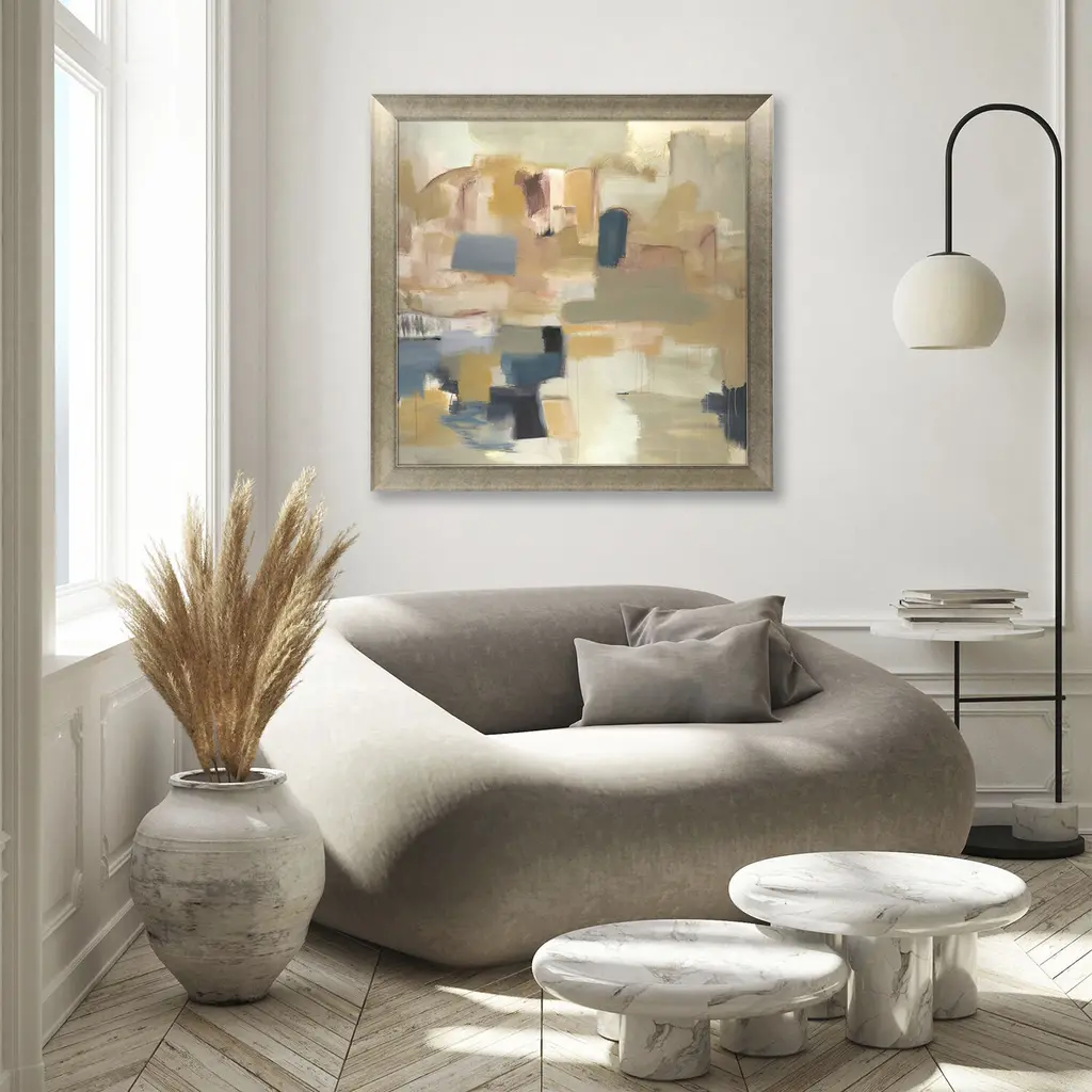 A geometric abstract giclee features block shapes in muted tones with touches of blue. The art is framed in a champagne gold finish moulding.
