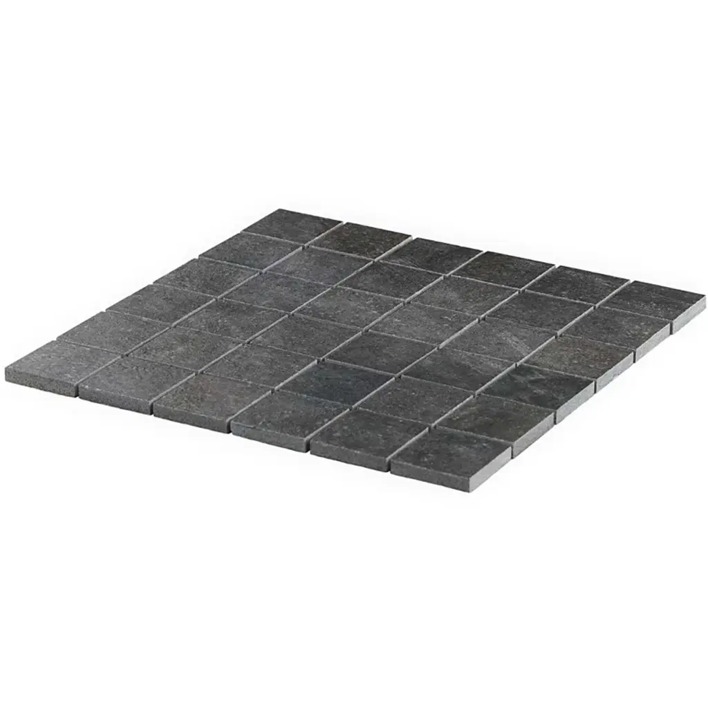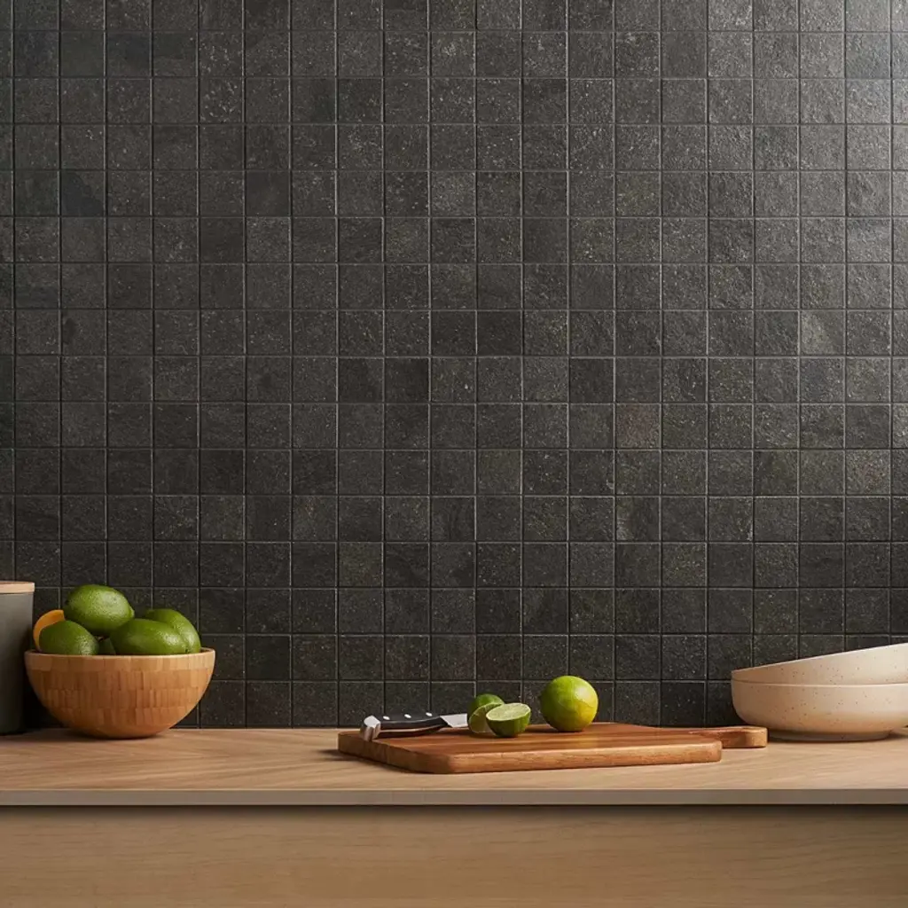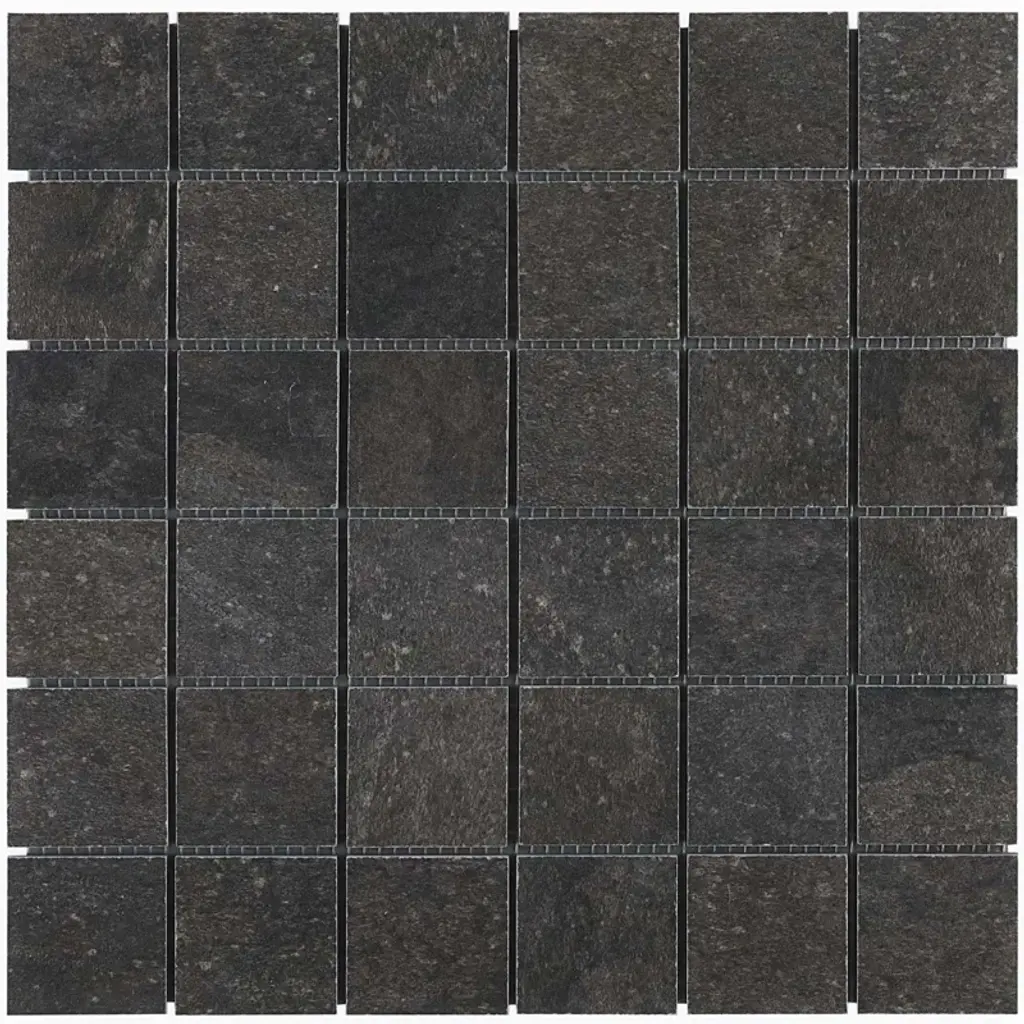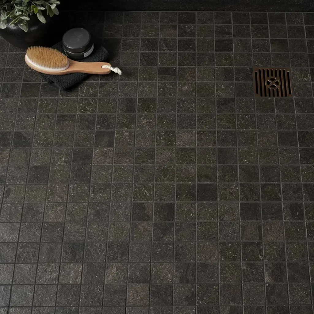 In warm tones of charcoal with variations in color and veining, Acadia 2x2 Limestone Look Matte Porcelain Mosaic Tile brings an elegant stone look to a small mosaic format. Enhanced by an organic-looking matte finish, and with the dependable durability of porcelain, this mosaic makes the exquisite beauty of natural stone an affordable and practical option, especially for large spaces. The earthy textures and natural tones of limestone, slate, and quartz are featured in our porcelain Acadia collection. This TileBar exclusive line offers a full suite of design-forward porcelain tiles with an organic look and feel. The architecturally inspired Acadia is available in a range of formats, making it suitable for any size project, in any indoor or outdoor space. Limestone, quartz, and slate are perennial favorites, both indoors and outdoors. Mix and match the various sizes and stone looks of the Acadia collection to create your composition. These tiles have anti-slip properties, making them suitable for bathrooms, hallways, and kitchens. The 2 cm pavers have a superior R11 anti-slip rating, making them especially safe for outdoor use and poolside.