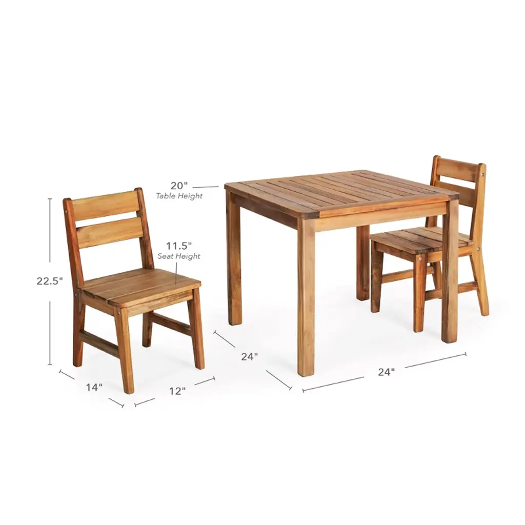Set up a welcoming outdoor space where children can gather, explore, and create with the Acadia Outdoor Square Table and Chairs Set. Crafted from durable, naturally weather-resistant acacia wood, this sturdy set brings lasting function and natural charm to patios, gardens, or nature-inspired classrooms. The child-sized table and two coordinating chairs offer a comfortable space for drawing, building, snacking, or simply spending quiet time outdoors. Whether they are painting with found leaves, reading together, or sharing stories, children have a dedicated place to sit, imagine, and connect with the world around them. Table measures 20in H x 24in L x 24in W. Chair measures 22.5in H x 14in D x 12in W, with seat height 11.5in & Seat Depth 10.5in.