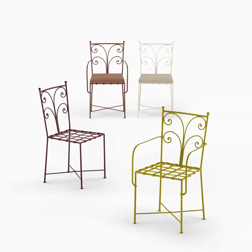 Exuding femininity with its harmonious lines, this matte-white chair is the ideal addition to elegant patios or terraces. Soft sand-toned fabric (ref. Dune T401) envelops the seat's cushion for enhanced comfort, its level maximized by the couple of curled elements the backrest consists of. Powder-coated for exceptional weatherability, the galvanized iron structure is available in multiple color variants.
