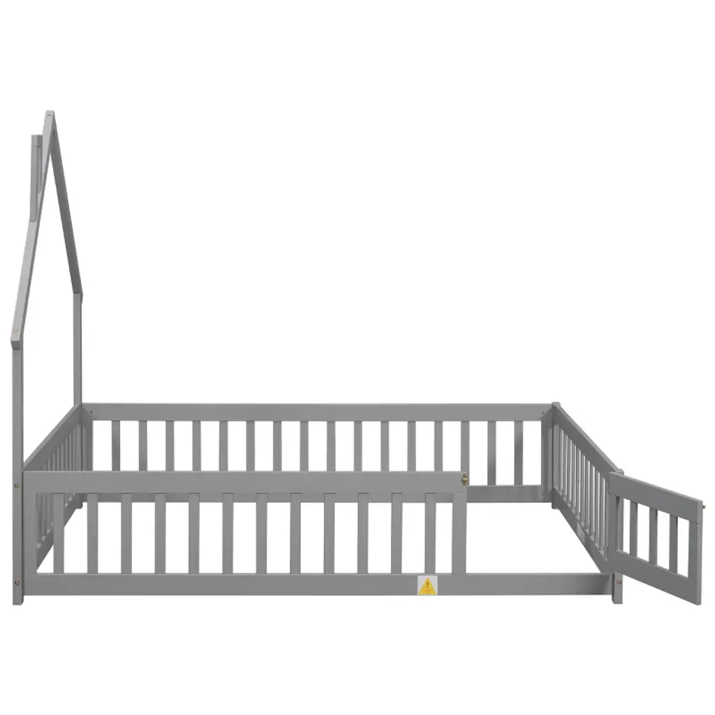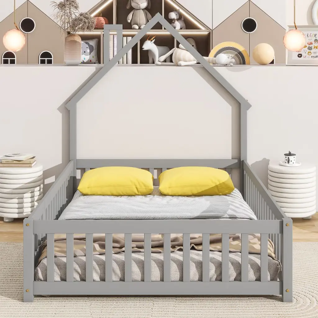 Bring imaginative charm and cozy comfort to your child’s room with this full-size house-shaped floor bed. Crafted from durable pine wood, this bed features a charming house-profile headboard that encourages creativity and playful exploration. The surrounding fence-style guardrails with a small latch door offer added safety while providing easy access in and out of bed. Built with stability and safety in mind, the frame ensures a secure and comfortable sleeping experience. Designed for a full-size mattress, this bed blends decorative style with practical functionality. Its neutral tone and solid wood construction make it a versatile addition to a variety of interiors. Delivered in a single box with detailed instructions and all tools required for smooth assembly.