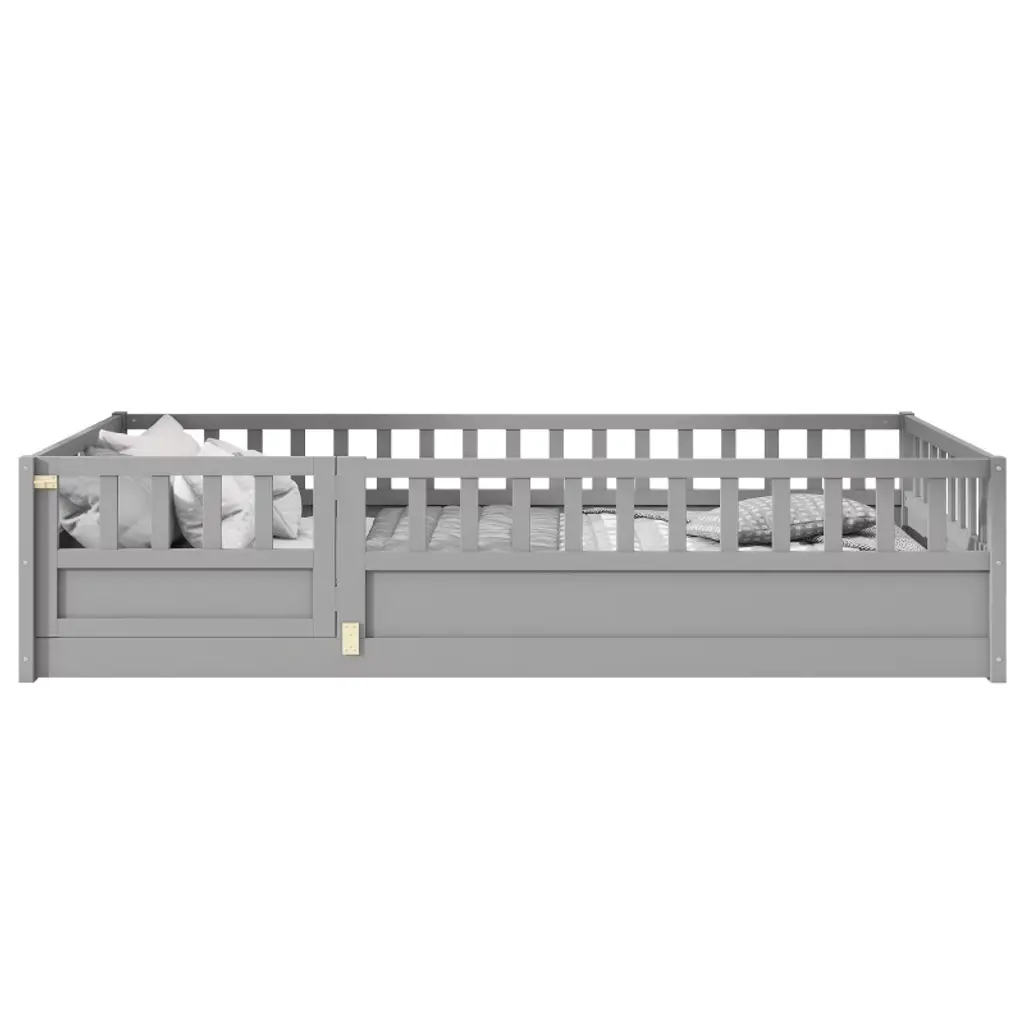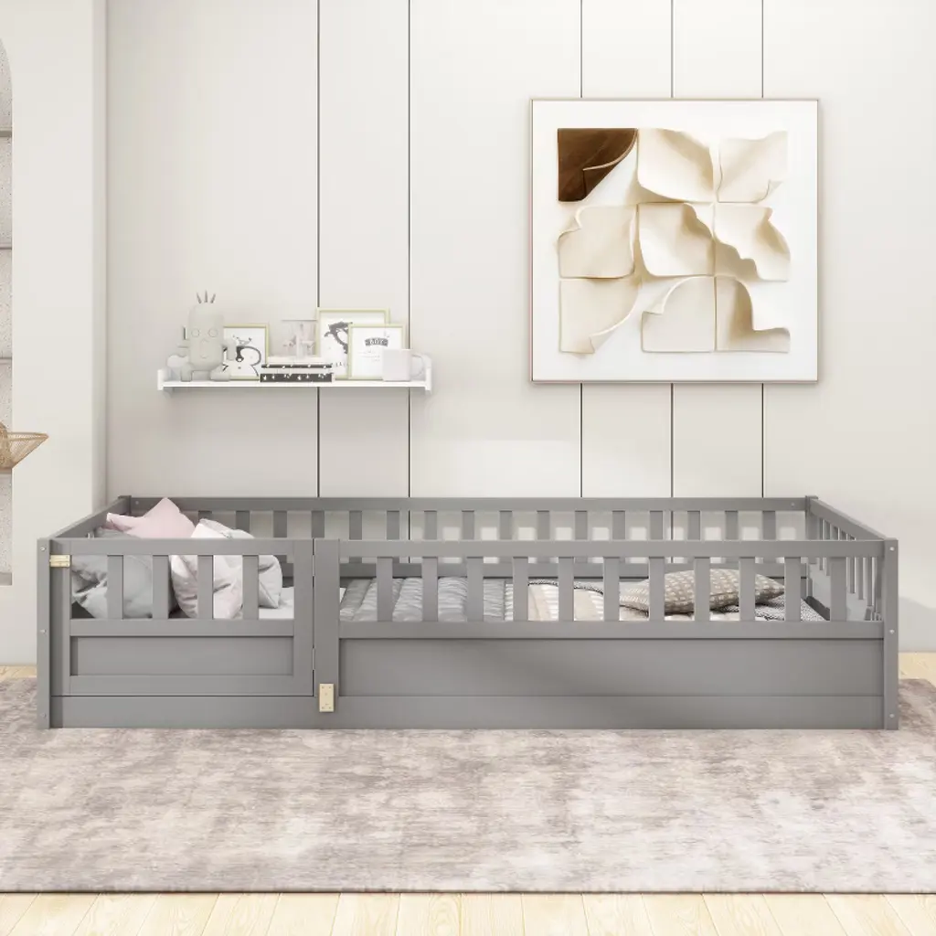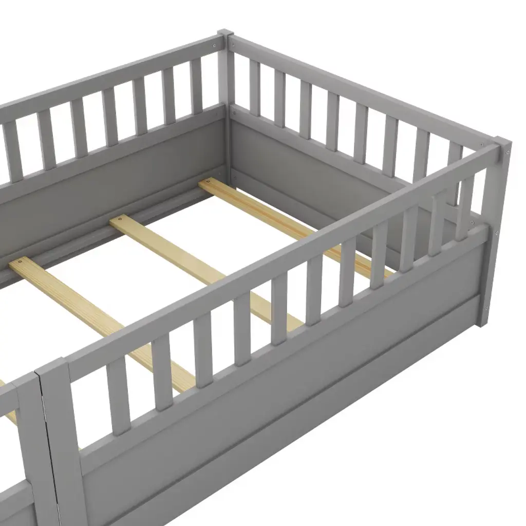 This twin-size floor bed blends practical design with child-friendly safety features. Made from durable pine wood, it features a fully enclosed frame with high guardrails for added protection and a cozy sense of space. The supportive slat structure offers stability while allowing for comfortable mattress placement directly on the floor. With an easy-access opening and inviting layout, children can enjoy independent use for sleeping, reading, or playtime. The overall structure enhances both durability and aesthetics. Delivered in a single box with a full set of hardware and instructions, assembly is quick and simple.